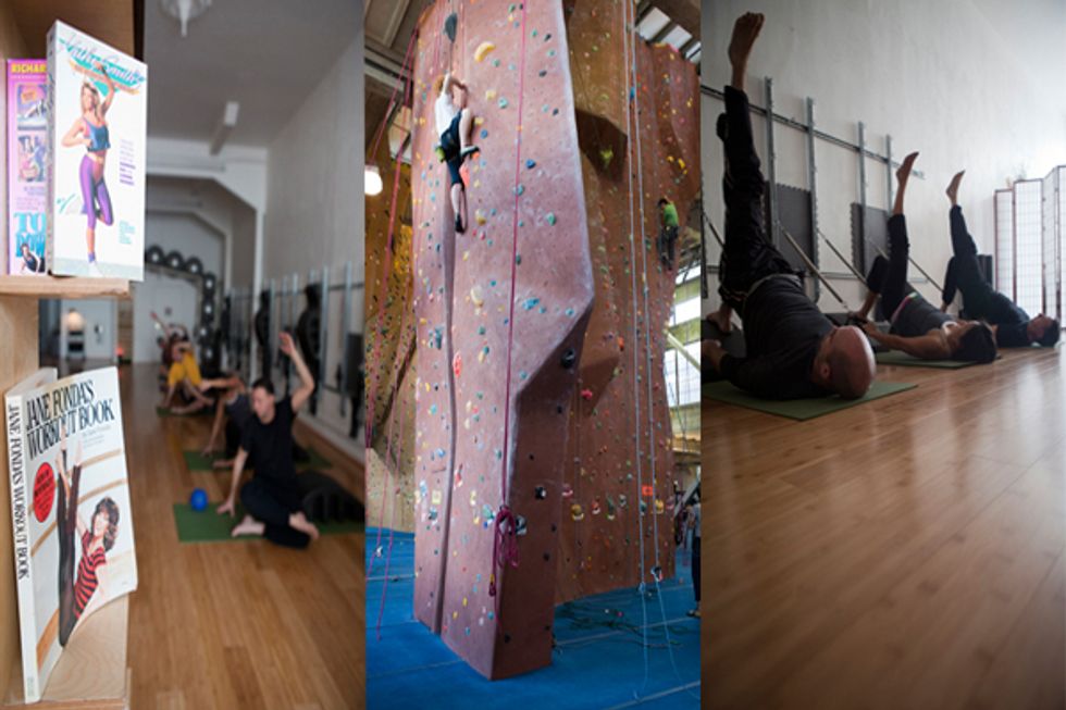 A couple scenes from Bad Joe's Body Shop: leg exercises with the wall mounted spring track and some inspirational workout material. In the center image is one of the many giant walls at Planet Granite.