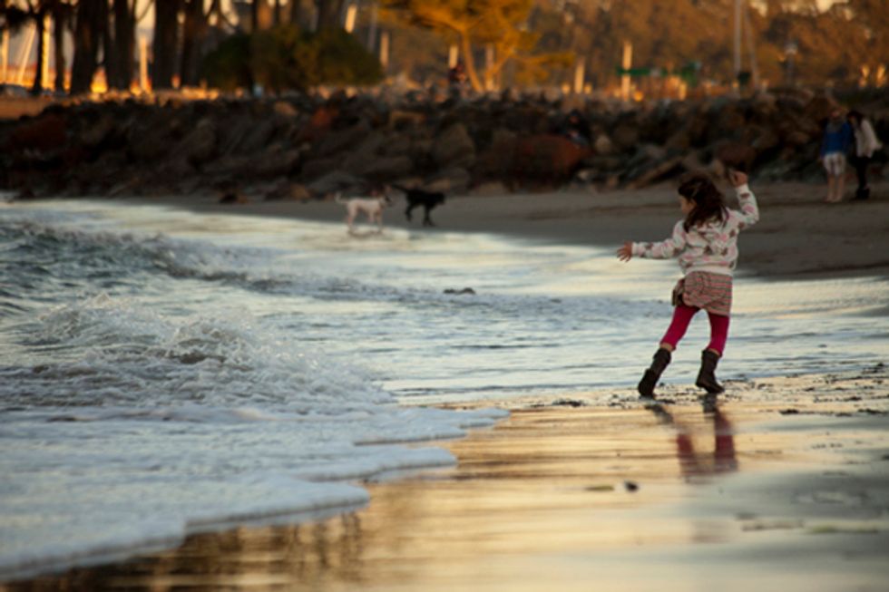 A young girl enjoys the outdoors by dancing around and dodging waves on the beach near Crissy Field.