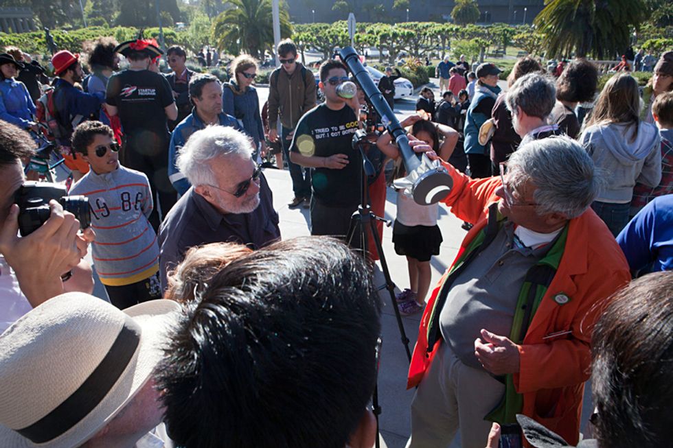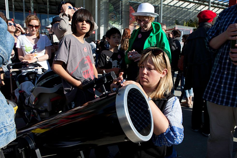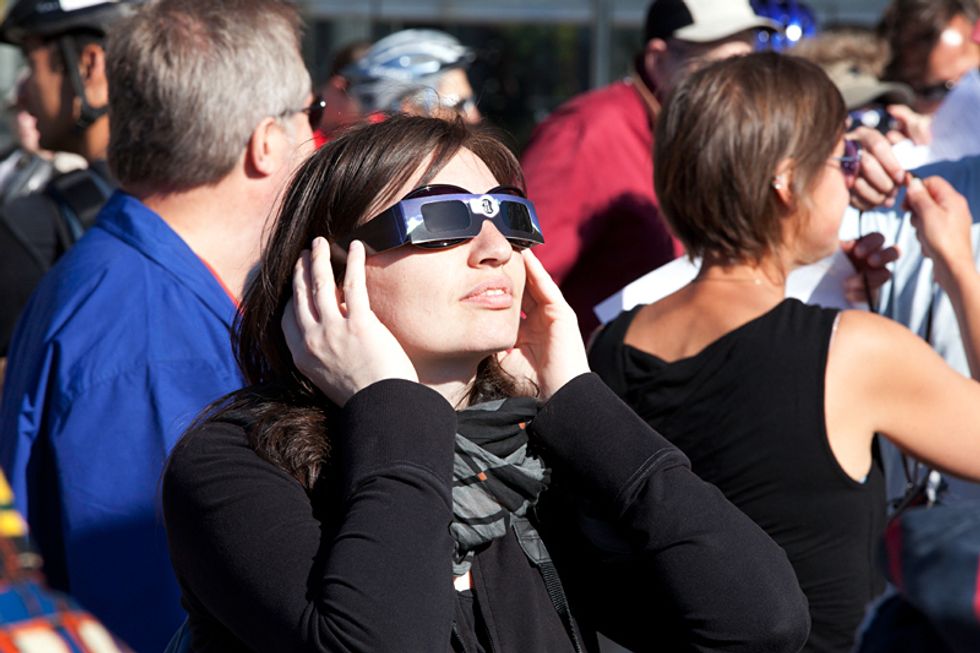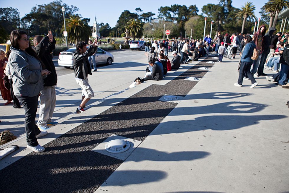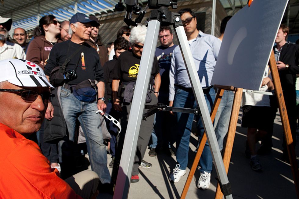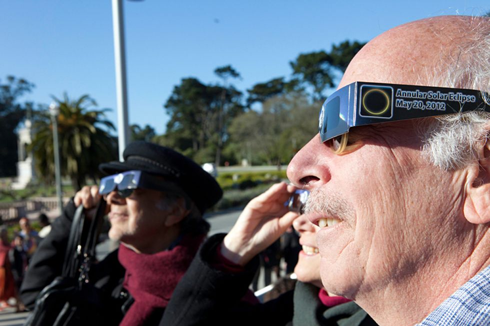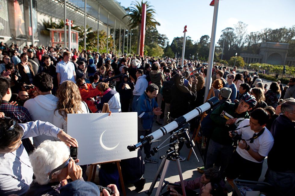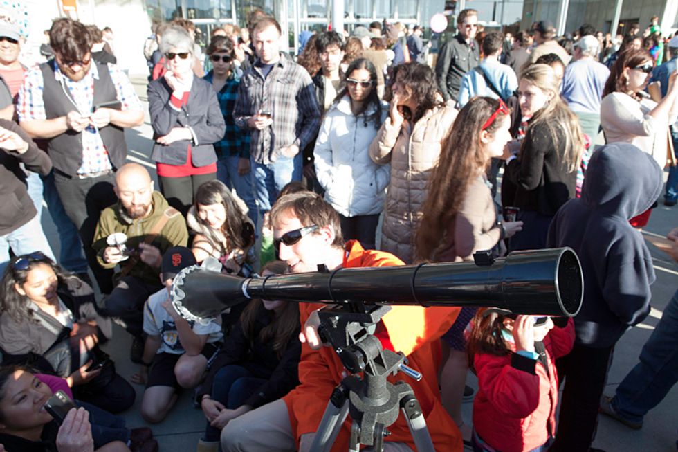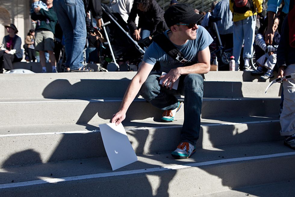 If you had any energy left after Bay to Breakers madness, then a bit after five o'clock yesterday you were treated to a rare annular solar eclipse with about 84% of the sun covered by the moon. If you were watching from anywhere in the city, you saw the crescent-shaped shadows, a sharp crescent shaped sun and the strange feeling that the sun was being stolen from us. We camped out at Cal Academy of Sciences at the eclipse viewing party. Enjoy the slideshow.