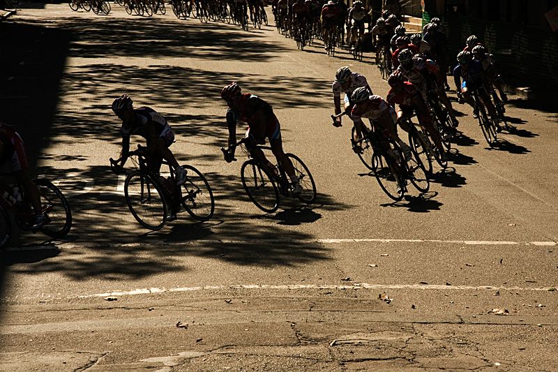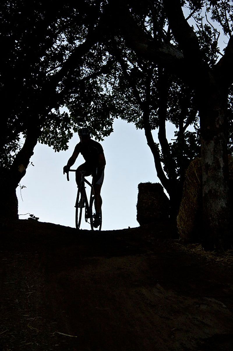 A cyclist comes over a hill in the SF Bicycle Expo at Cow Palace.