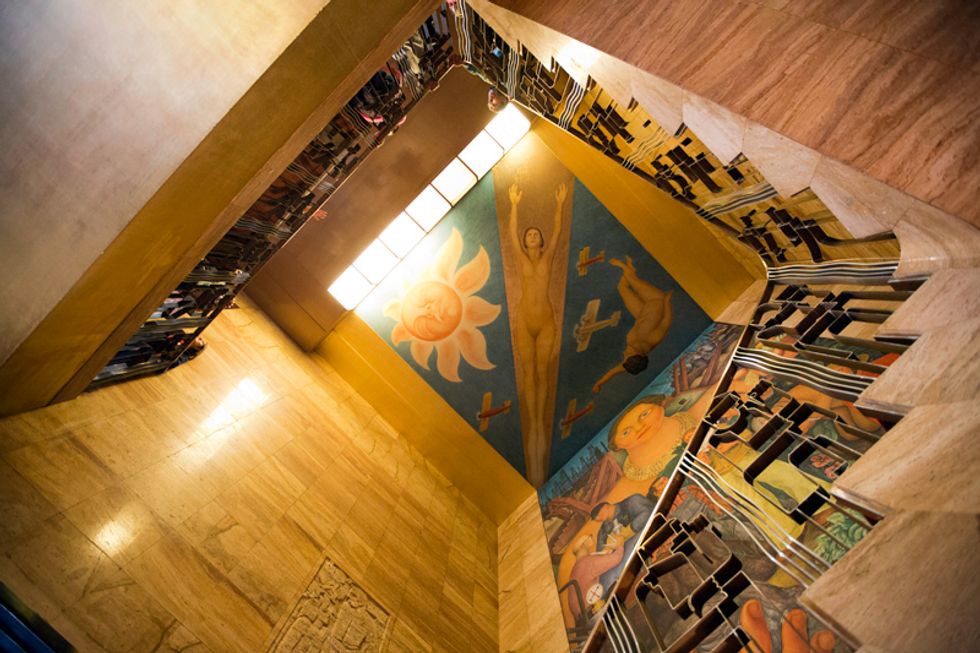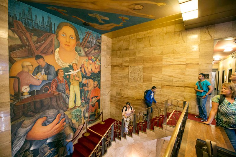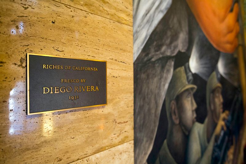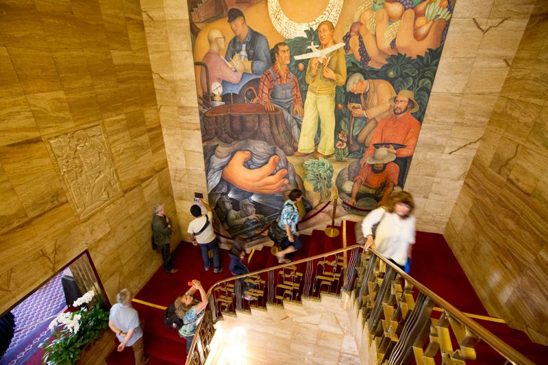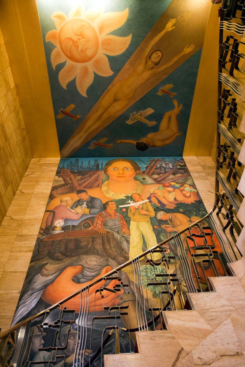 Also referred to as Riches of California, Rivera's 1931 fresco in the City Club (the Pacific Stock Exchange during Rivera's time) spans two floors, wall and ceiling, of the venue's grand stairwell.