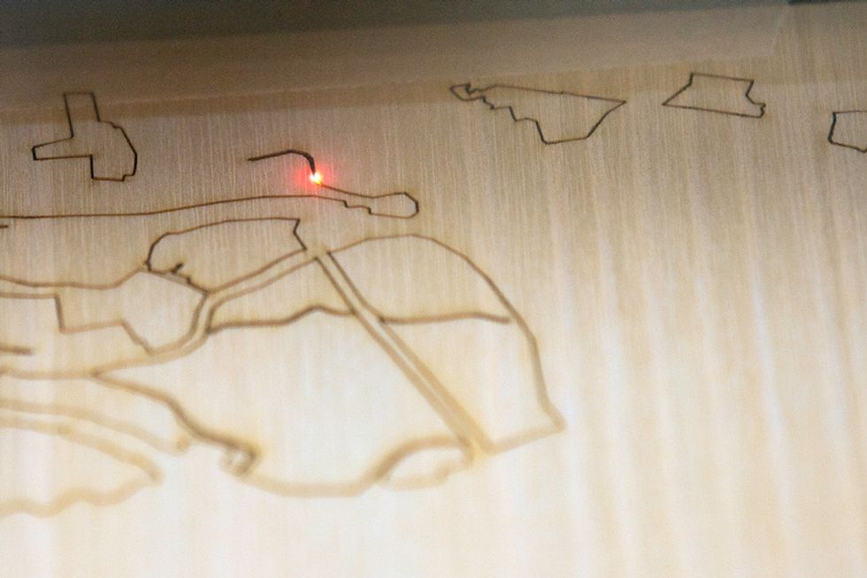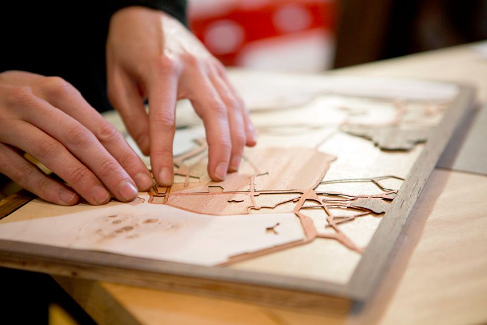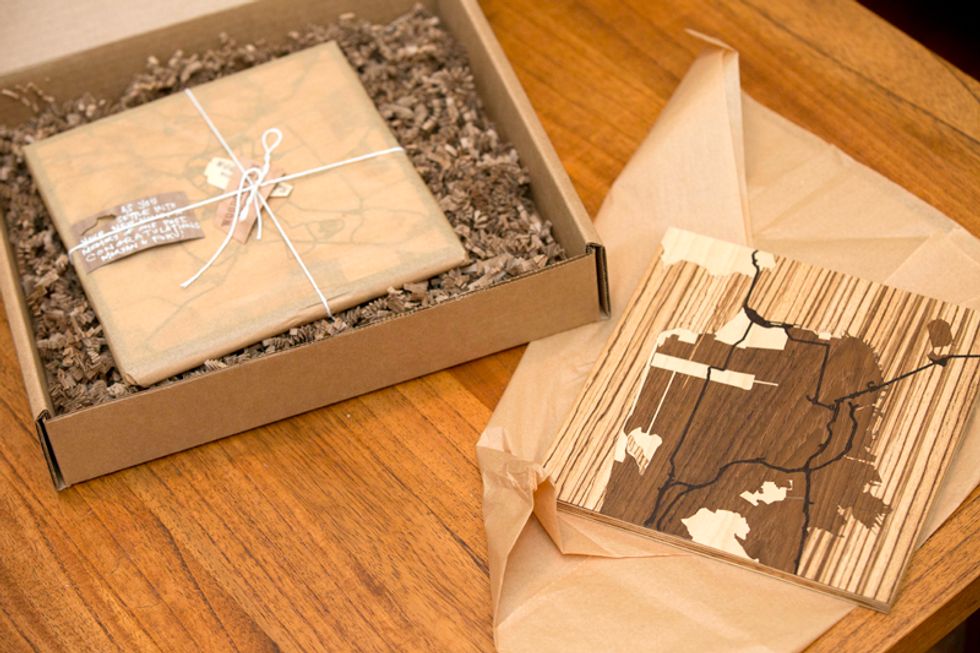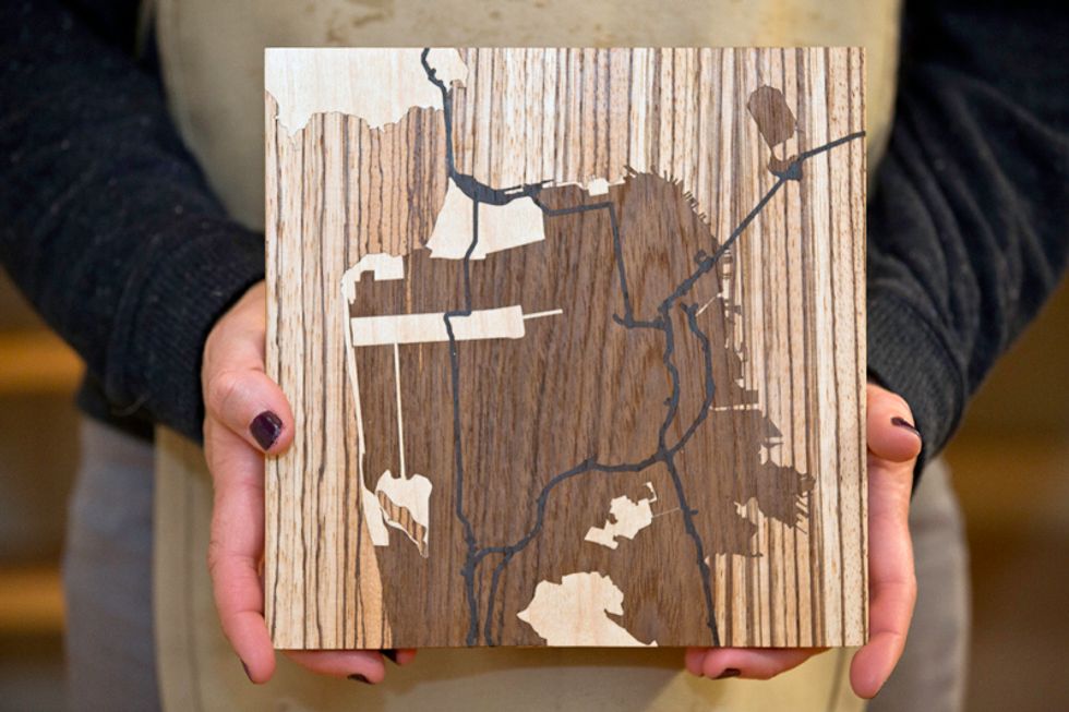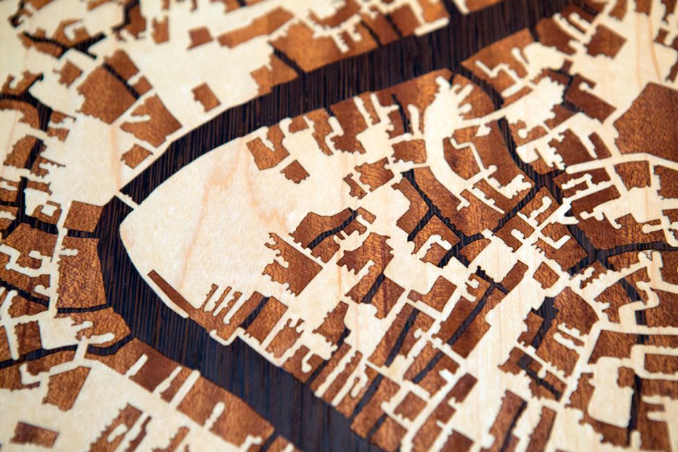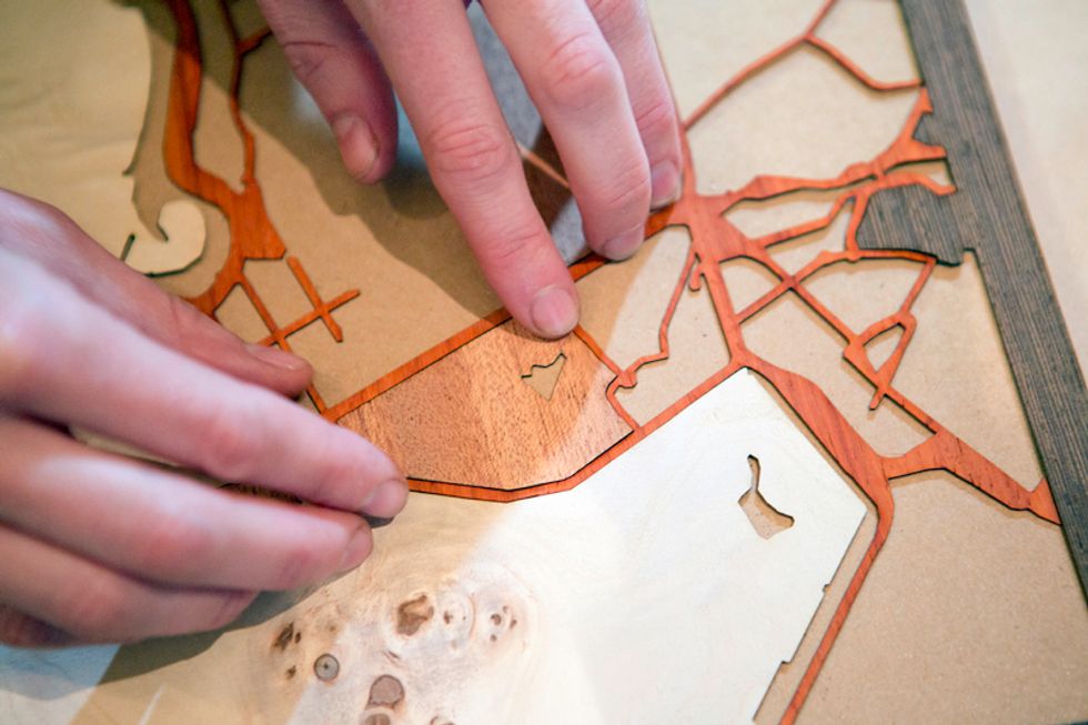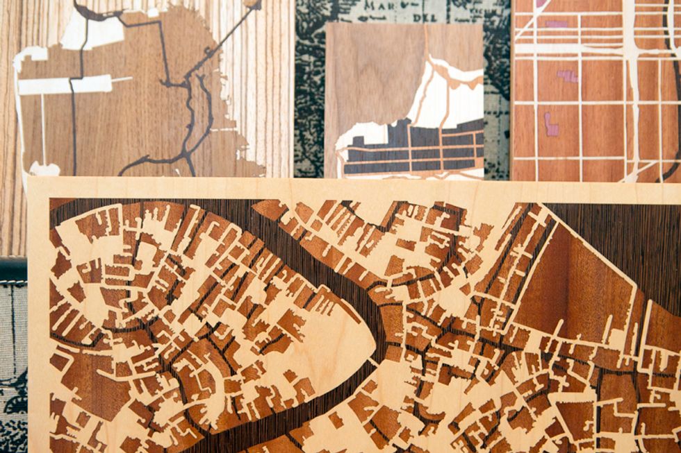 Built from laser-cut pieces that are then assembled like a puzzle, Woodcut Maps offers 40 hardwood veneers including ebony, zebrawood, teak and African mahogany. To add to the intricacy of the map, a different veneer can be used for each of four map elements: roads, landscapes, water and parks.