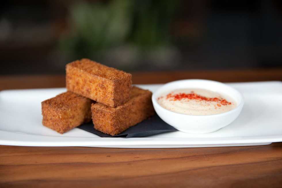 Chambers Eat + Drink Chef Trevor Ogden originally served his grits creamy with a braised pigs feet croquette, adding a smoky element to mimic how southern cuisines smoke their pigs feet. After that dish had its run, he looked for a new way to use them. Because they were so good and unique, he remembered making chickpea frites with Chef Mark Denham before he opened Laiola, and transformed the grits into fries. Smoke on these.