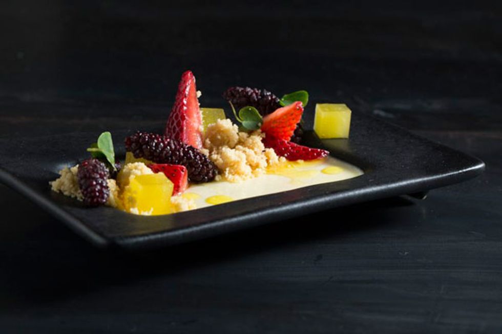 14. Garnish the cremeux with the macerated strawberries, your favorite shortbread (crumbled), and a light a pinch of sea salt.