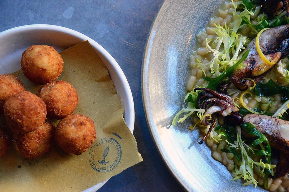 Among its most iconic dishes is an antipasto that has headlined the menu since the restaurant's opening in 1998: grilled calamari with warm white bean salad.