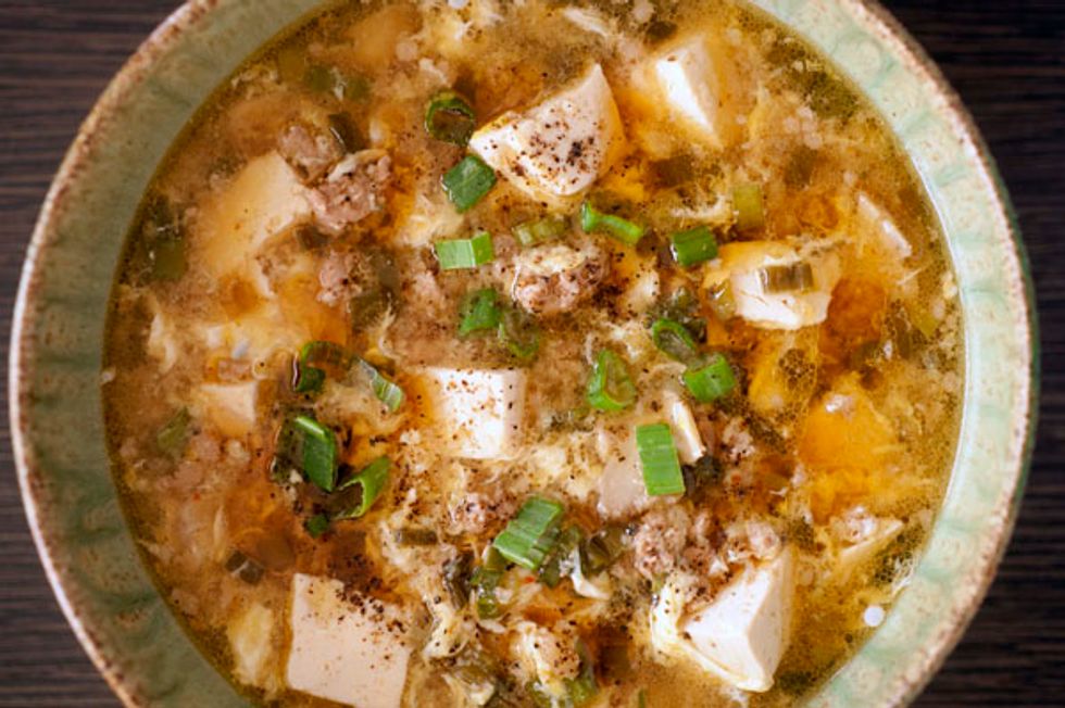 3. In a small bowl, whisk the eggs until blended. With the soup at a steady simmer, slowly whisk in the eggs so they form strands. Bring the soup back to a simmer. Divide the soup among four bowls and garnish each with a little sesame oil, scallion, and white pepper. Serve immediately. The soup can be stored in an airtight container in the fridge for up to 3 days.