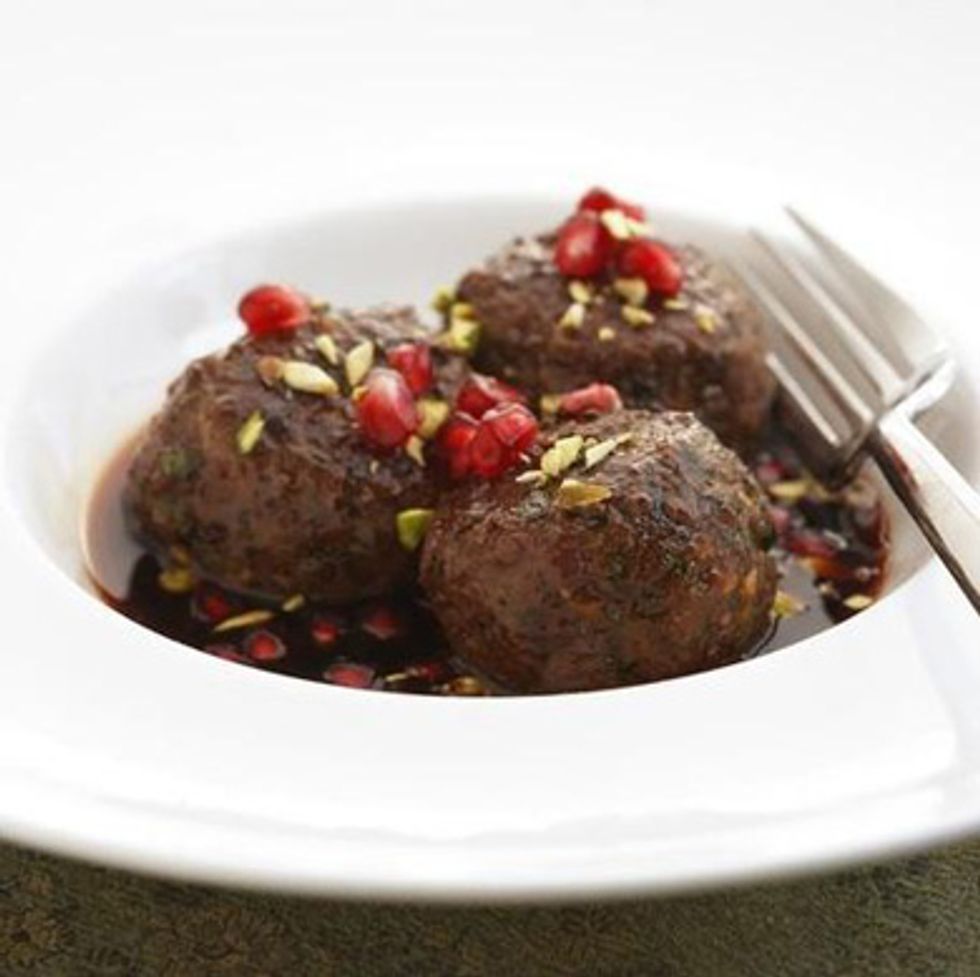 5. In a frying pan with a deep lip, place one-third of the sauce. Add five meatballs, and toss with the glaze for 2 minutes over medium heat. Continue incorporating glaze with remaining meatballs in this fashion until all 15 meatballs are glazed. Place on a serving dish, garnish with finely chopped pistachios and pomegranate seeds, and serve.