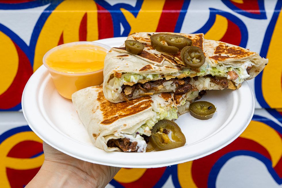 Señor Sisig's new Mission restaurant comes with fresh menu items, including the Sisig Crunch-a-dilla, a Filipino-Mexican spin on Taco Bell's cult-loved item. Here a flour tortilla is layered with monterey jack cheese, sisig pork, lettuce, guacamole, and a thin crunchy tostada, before being wrapped up and grilled. Served with a side of nacho cheese for dipping, this dish is a must-order.