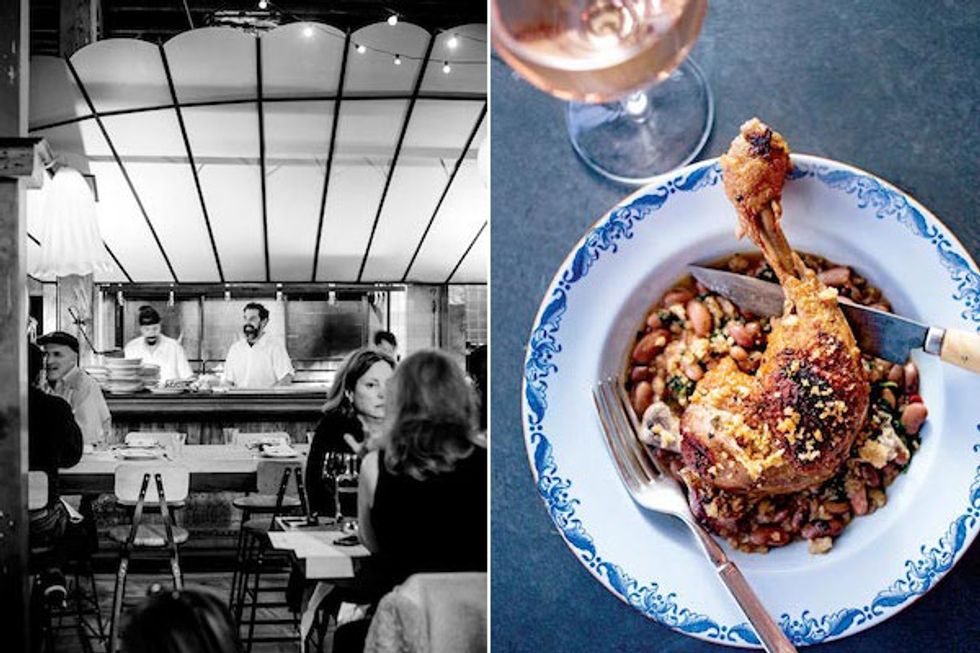 (Left): “I’m a lusty guy. That’s why I cut up animals and cook them over fire,” says Hallowell, who is happy to be cooking on a grill once again. (Right): Hearty braised chicken leg, speckled with bread crumbs, tops a bed of borlotti beans, nettles, and hot pepper. The restaurant’s antique plates were sourced at local flea markets.