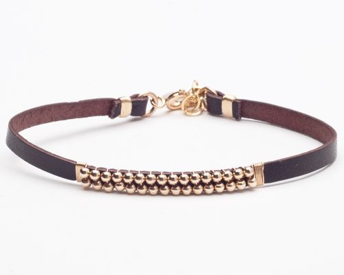 7. Viv & Ingrid Gold & Dark Brown Leather Bracelet with Gold Beads, $74