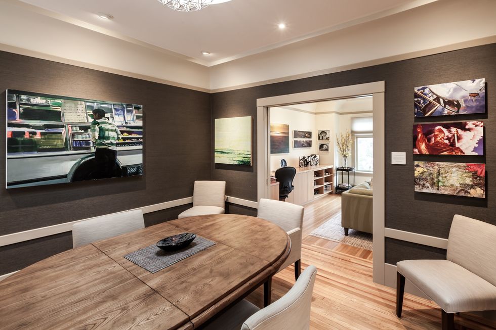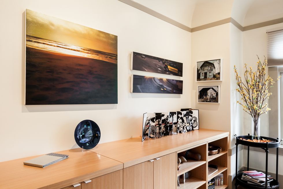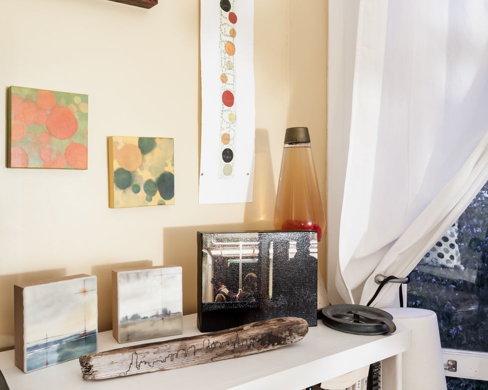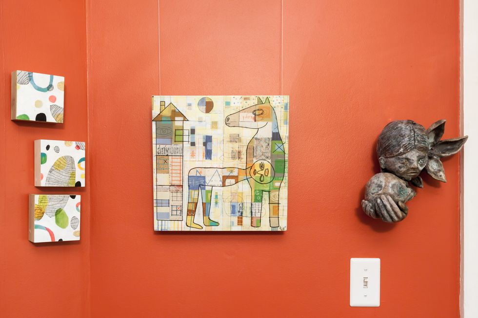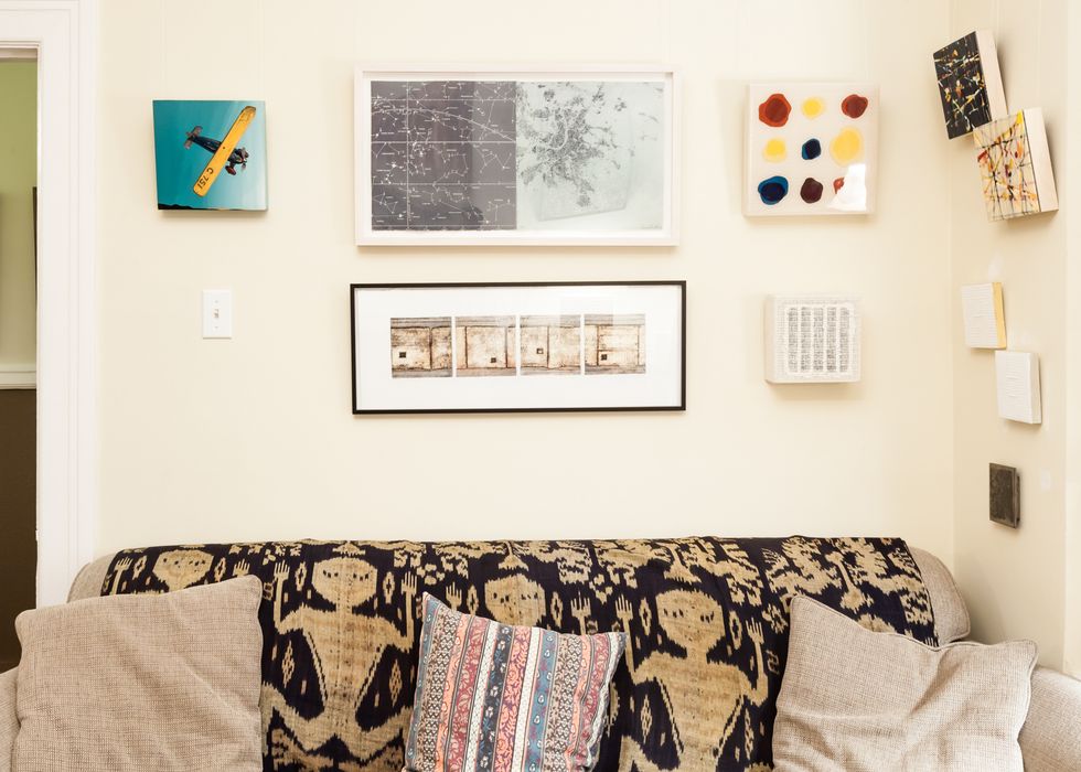 Chris Gilbert, 46, works in the medical industry and lives with his brother on the second floor of a Victorian house in Noe Valley. An avid art collector and active member of Artspan, a local non-profit art organization, Gilbert has sourced many pieces at San Francisco Open Studios over the years. In the entryway of his home, which is decorated with mid-century vintage finds, hang a large picture by Boston-based photographer Peter Harris, which captures the Big Dig in Boston. On the opposite wall is Giratutto: Wheel of Life by San Francisco painter Rachel Znerold, which depicts a colorful rotating wheel. Znerold actually specifically recommended the painting for Gilbert. "On these walls are all my friends," says Gilbert, who started collecting in 1991. "For me, each piece has an emotional value because it is part of my community."