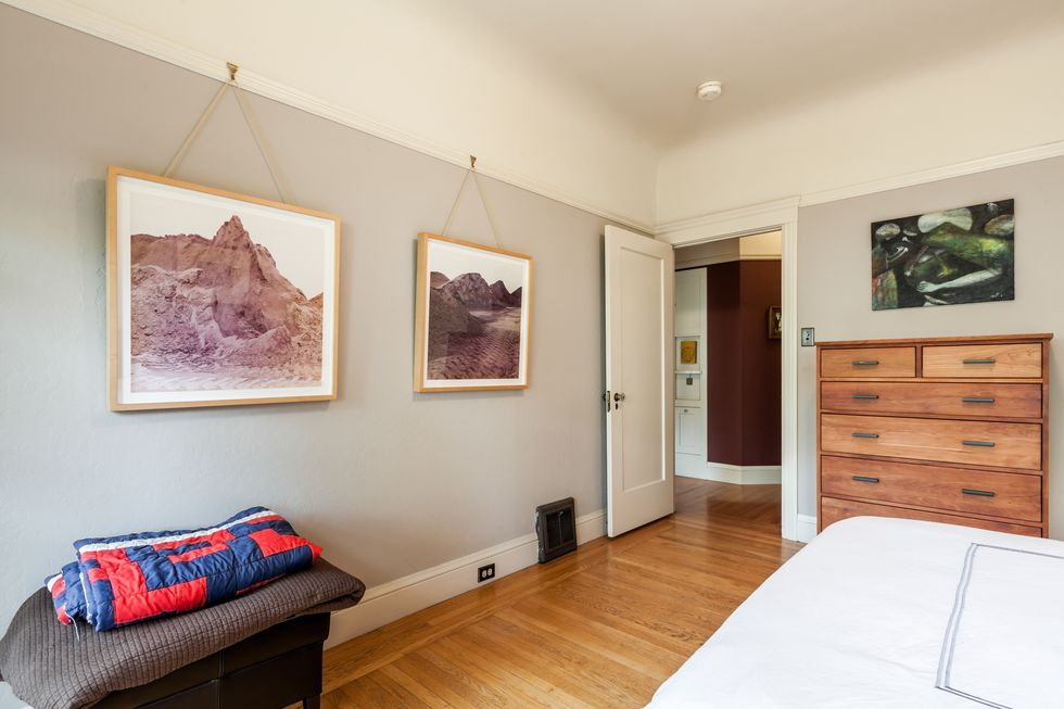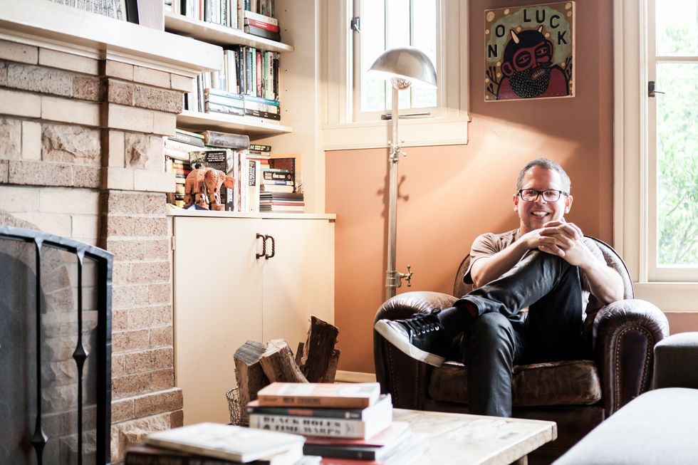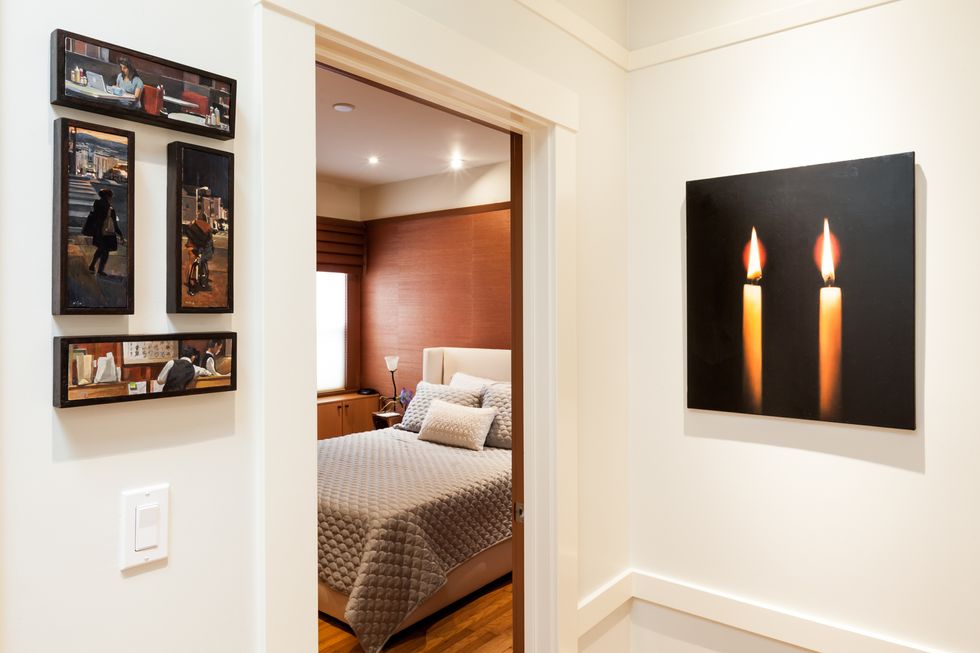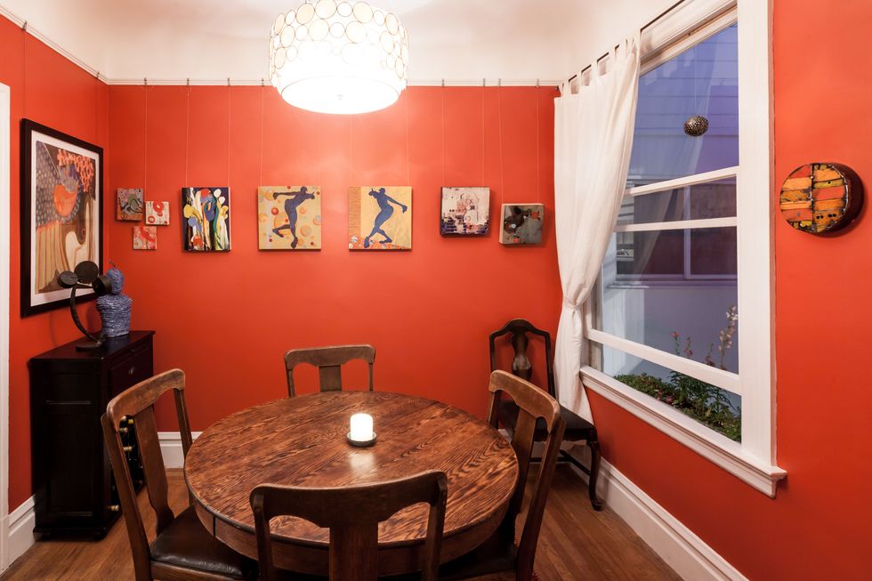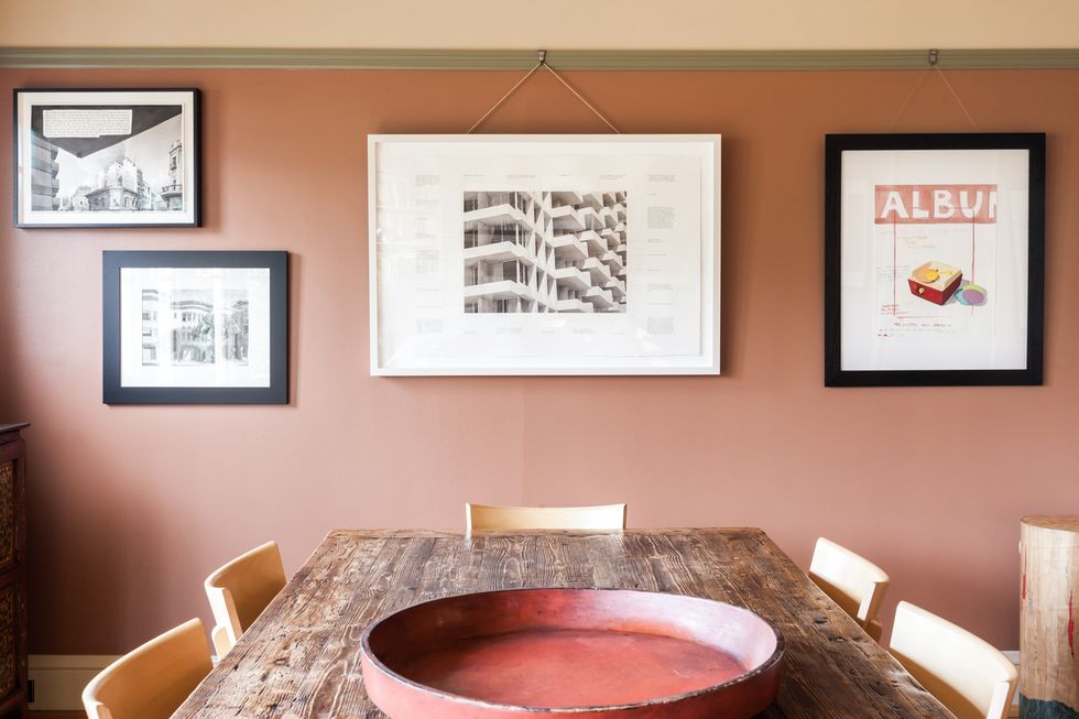 Chris Gilbert, 46, works in the medical industry and lives with his brother on the second floor of a Victorian house in Noe Valley. An avid art collector and active member of Artspan, a local non-profit art organization, Gilbert has sourced many pieces at San Francisco Open Studios over the years. In the entryway of his home, which is decorated with mid-century vintage finds, hang a large picture by Boston-based photographer Peter Harris, which captures the Big Dig in Boston. On the opposite wall is Giratutto: Wheel of Life by San Francisco painter Rachel Znerold, which depicts a colorful rotating wheel. Znerold actually specifically recommended the painting for Gilbert. "On these walls are all my friends," says Gilbert, who started collecting in 1991. "For me, each piece has an emotional value because it is part of my community."