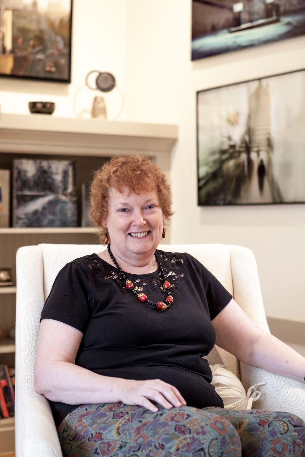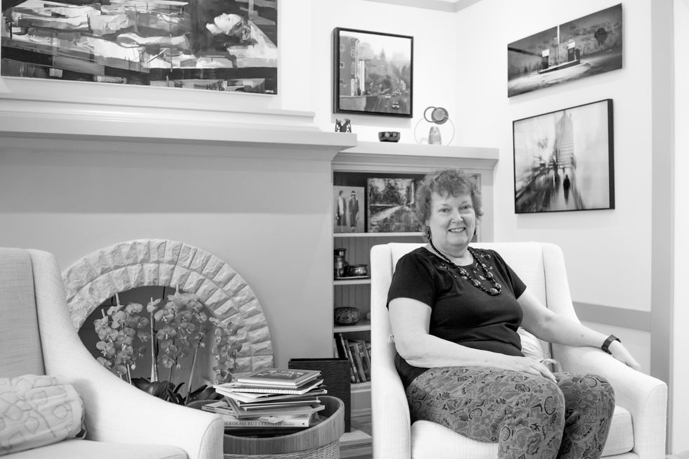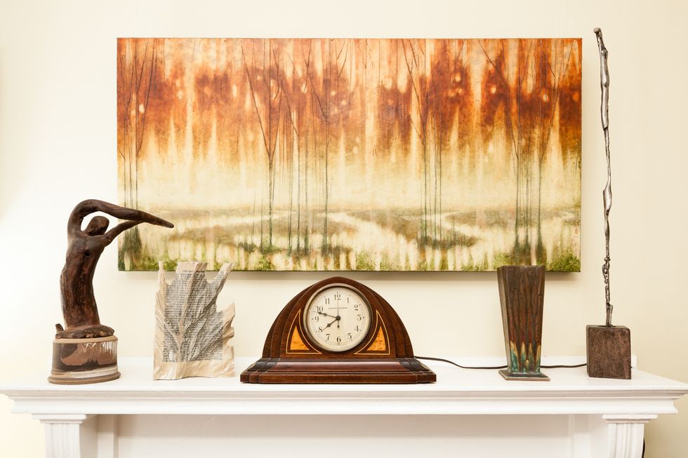 Cynthia Farner's art collection includes more than 200 pieces. "I started to collect seriously when I moved into this house in 1991. A friend of mine introduced me to local artists," says Farner, a doctor, who lives in a two-story, Spanish-style home on the edge of the Presidio "The first piece I bought was at 66 Balmy, a gallery that no longer exists. It's a painting by Gage Opdenbrouw, a Bay Area artist who has been involved in Open Studios and now lives in Oakland. The exhibition announcement showed the image of a woman—I loved it and I bought the painting before the opening," she says, pointing to the piece in the living room. Farner has other pieces by Opdenbrouw, including one of the San Francisco cityscape at dawn, which hangs in her entryway, and another in her bedroom, a peaceful, closeup landscape of tree trunks in a forest with muted green sunlight streaming through them. "When I come home, I love to see all my paintings. They can cause different emotions. I couldn't imagine my home without them."