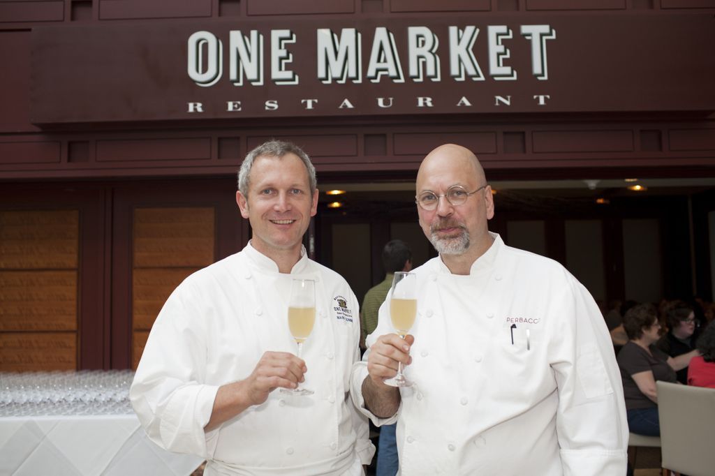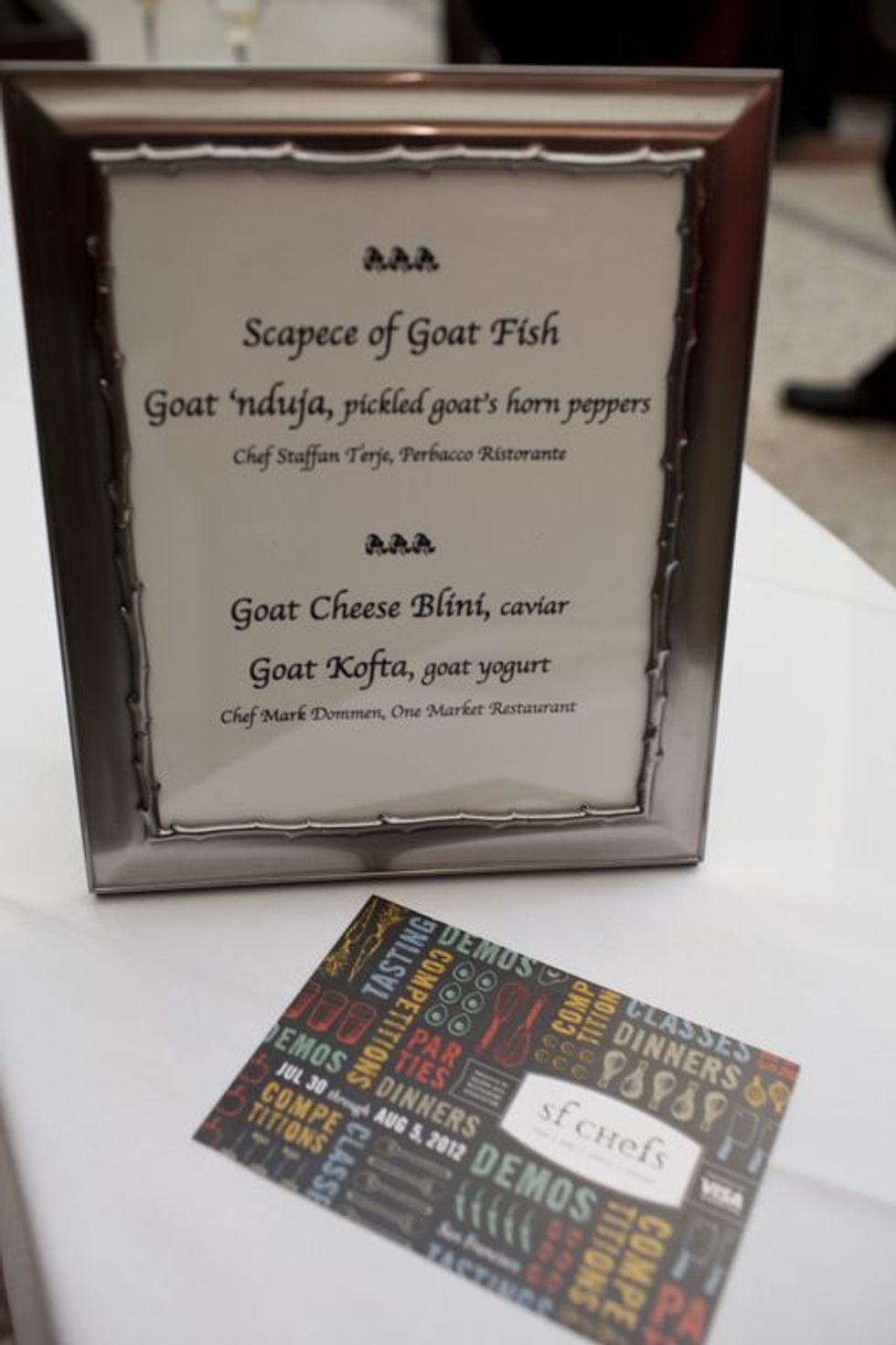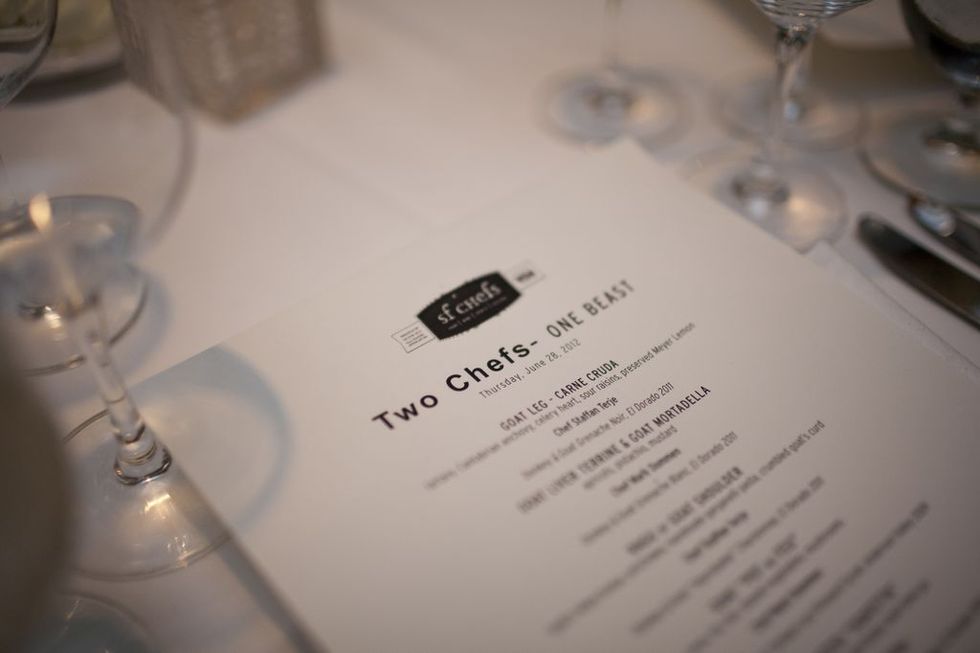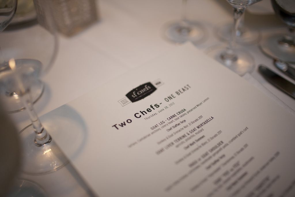 On the evening of June 28th, some meat-loving, nay, make that goat-loving diners gathered at One Market for Two Chefs—One Beast, one of the sold-out dinners in the Dinner Party Project. Chefs Mark Dommen (One Market) and Staffan Terje (Perbacco) are two of the city’s best chefs, and are known for their skill with meats, and specifically using the whole animal. Tonight’s meal used three goats from Rossotti Ranch, and the long menu (seven courses!) highlighted many different cuts and techniques.