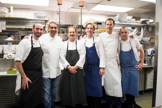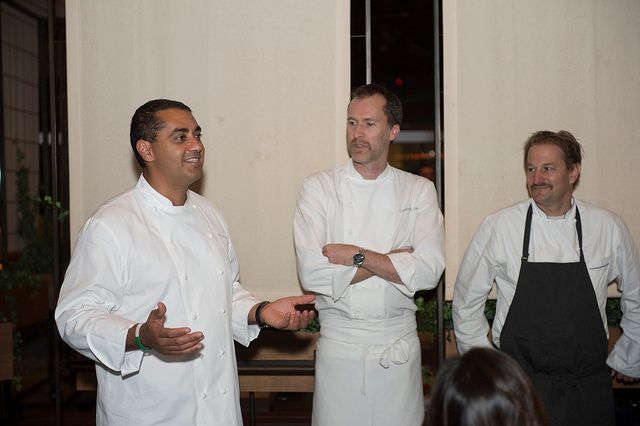 Michael Mina is one of San Francisco's most iconic celebrity chefs, and for his Dinner Party Project appearance, he assembled the team that makes his trio of local restaurants possible: Michael Mina executive chef Ron Siegel, RN74 executive chef Jason Berthold, Bourbon Steak executive chef Omri Aflalo, Mina Group corporate pastry chef Lincoln Carson, and Mina Group wine director Rajat Parr. Each chef contributed a course, with wine pairings by Parr, but the menu was designed to take the chefs out of their comfort zones. Aflalo, who typically works with meat at Bourbon Steak, contributed a fish dish, while seafood-centric Siegel tackled pork; pastry chef Carson submitted a savory starter, while Mina himself tackled dessert.