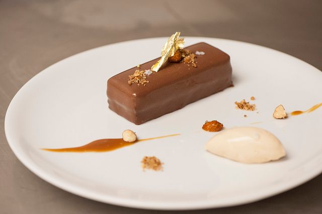 Mina, as pastry chef for the evening, presented his take on almond roca, the popular chocolate-covered toffee buttercrunch candy. The dish arrived looking much like the candy bar that inspired it, with crunchy almonds and caramel in a light, melting milk-chocolate coating, but the top-notch ingredients and accents of caramel mousse, gold-foil-coated almonds and almond powder ensured it was worlds away from its drugstore counterpart.