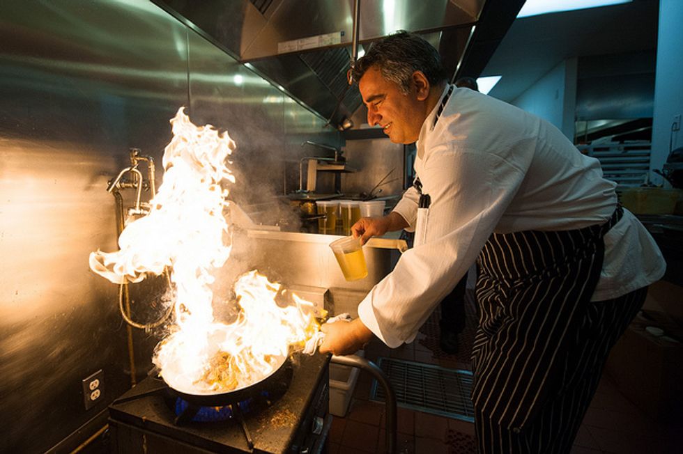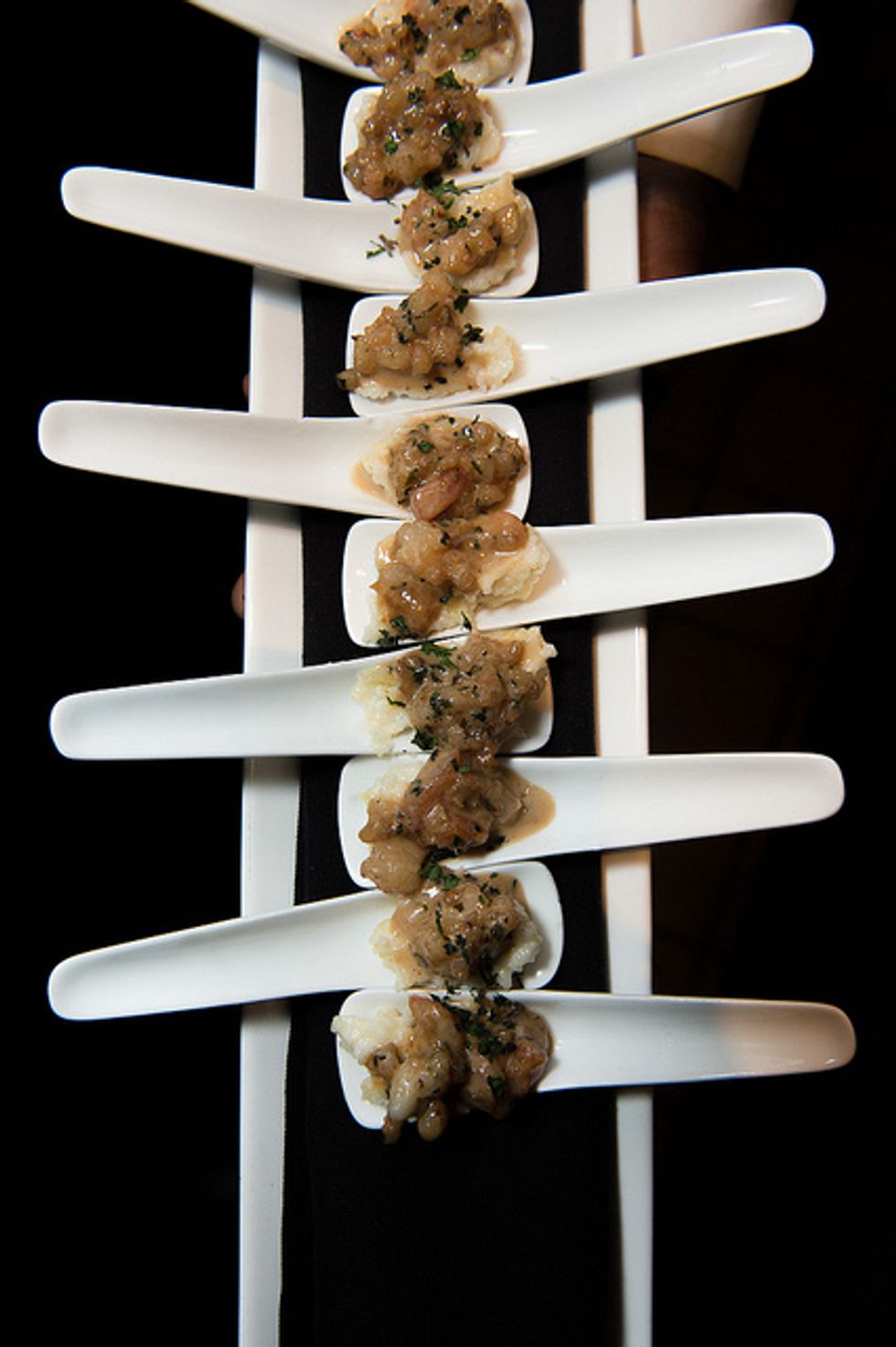 Indeed, "fun" was the tone of the trio's collaboration, which embraced Lawrence's Southern-influenced fare and Zaré's Persian-inspired creations in equal turn. The meal kicked off with amuse-bouches from each chef: Lawrence presented spoonfuls of his famed shrimp and grits, while Zaré offered addictive crunchy lavash triangles with delicata squash hummus and goat cheese. A piquant tequila-and-Campari cocktail emphasized Zaré's use of spice, while a Pimm's concoction with minted syrup and cucumber evoked down-home porch sipping.