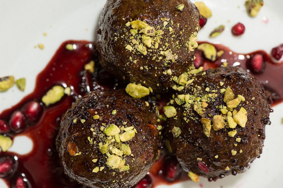 For his entree, Zaré offered a take on ghalieh mahi, a Southern Persian seafood stew seasoned with fresh cilantro and fenugreek. It's traditionally made with fish, but Zaré took the shellfish route, topping each plate with scallops, clams, mussels, and a tiny crawfish. The stew was accompanied by a crisp, arancini-like saffron rice cake.