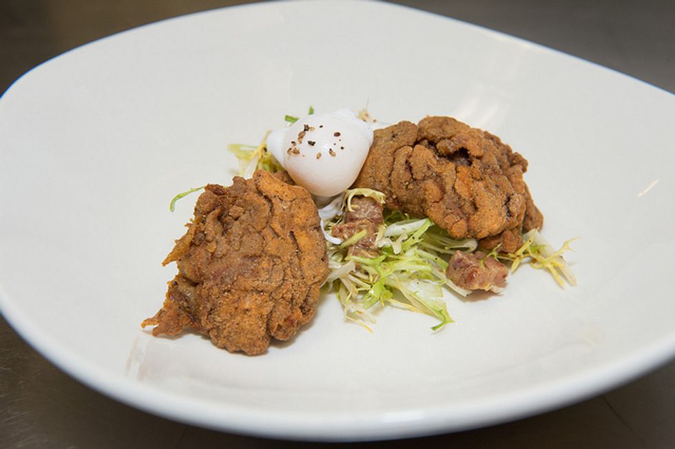 The meal itself kicked off with pistachio meatballs, a mainstay of Zaré at Fly Trap's menu. For this meal, Zaré switched out his usual beef meatballs for pork, and accented the pistachio with spicy harissa, tangy pomegranate sauce, and pomegranate seeds. Lawrence's buttermilk-fried quail salad was also a riff on one of his restaurant's most beloved dishes, fried chicken; served on a bed of frisee and bacon and topped with a poached quail egg, it was beyond decadent.