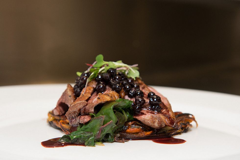 Lawrence's entree was equally rib-sticking, with pan-roasted Muscovy duck, sweet caramelized onion, tart huckleberry and creamy sweet potato all evoking Thanksgiving. Paired with a tempranillo created especially for 1300 at Tejada Vineyard in Lake County, it provided a hearty finish to the savory portion of the meal.