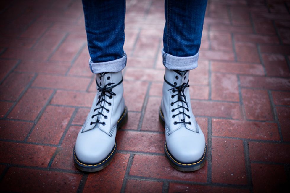 We caught Sergio exiting the Macy's Men's Store, already flaunting his new purchase. He dashed in to find a pair of boots after his shoe tore and found this classic pair. I've never seen Docs in this matte gray, but I really like them -- especially contrasted with the iconic yellow stitching.