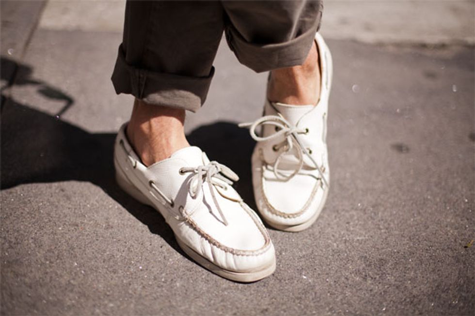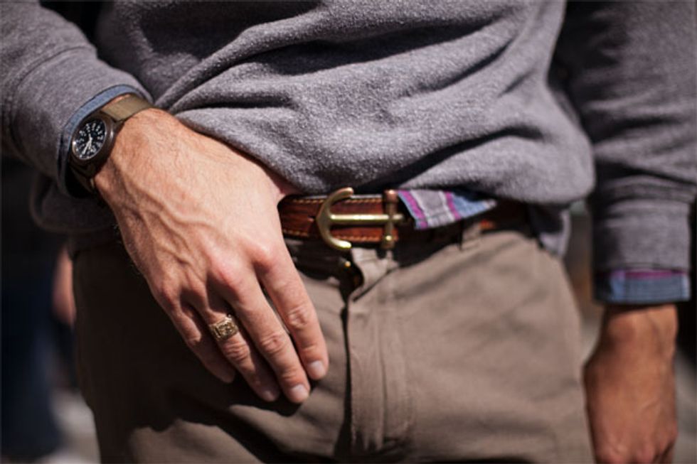 What he's wearing outside Tartine: Vintage Eddie Bauer plaid shirt, purchased from Buffalo Exchange; Gray Alternative Earth crewneck sweatshirt, purchased from Alternative Apparel; Trousers and leather belt with anchor buckle from J. Crew; Sebago white leather boat shoes, purchased from DSW; Paul Smith sunglasses, purchased at Bloomingdale's; Timex watch, purchased from Alternative Apparel; Kenmore High School Class of 1937 ring, a family heirloom from Gabe's grandmother, resized and filled with gold by local jeweler, Claudia Kussano.