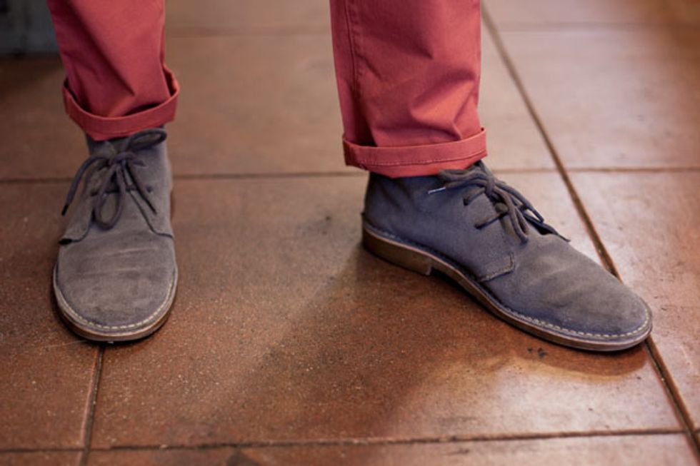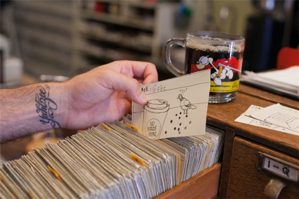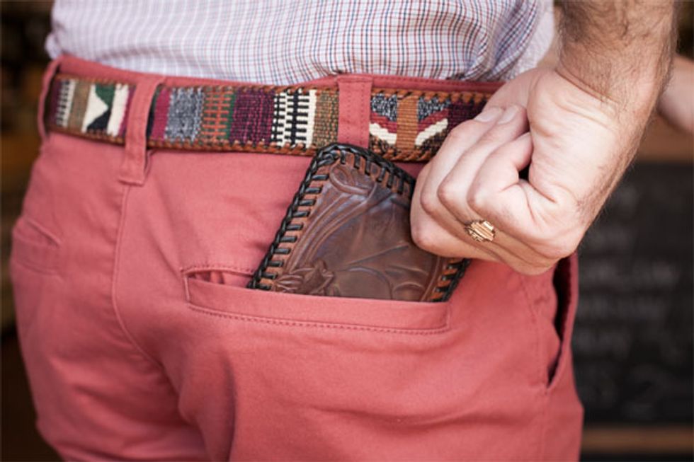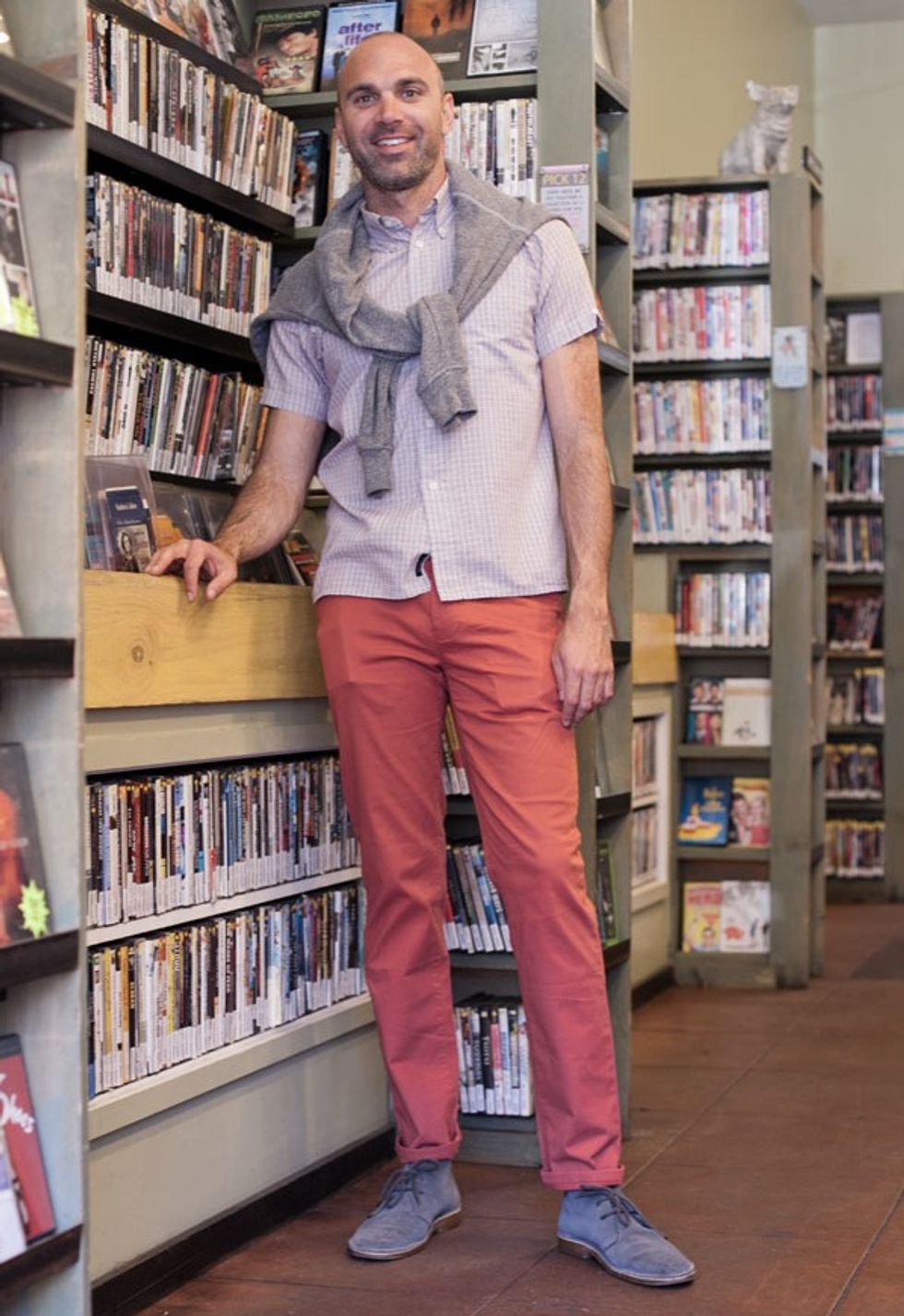 What he's wearing at Fayes Video: Ben Sherman plaid short-sleeve shirt and suede desert shoes; Gray Alternative Earth crewneck sweatshirt, purchased from Alternative Apparel; Hawkings McGill coral pants, purchased from Urban Outfitters; Artesania woven and leather belt, purchased from Urban Outfitters; Handmade vintage wallet, purchased from Decades of Fashion; "Yahtzee" tattoo by Ross K. Jones.