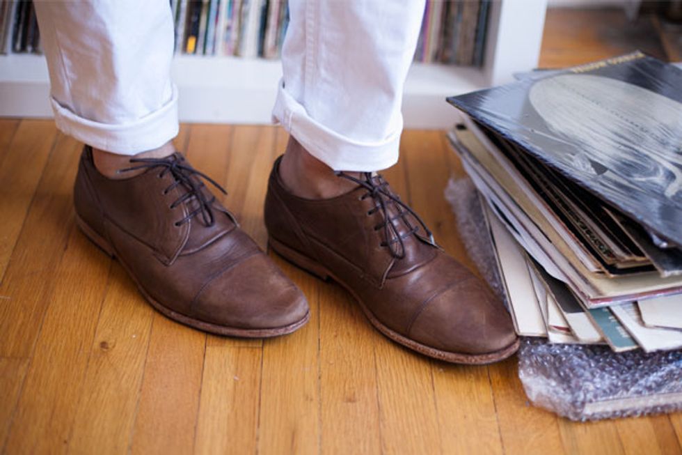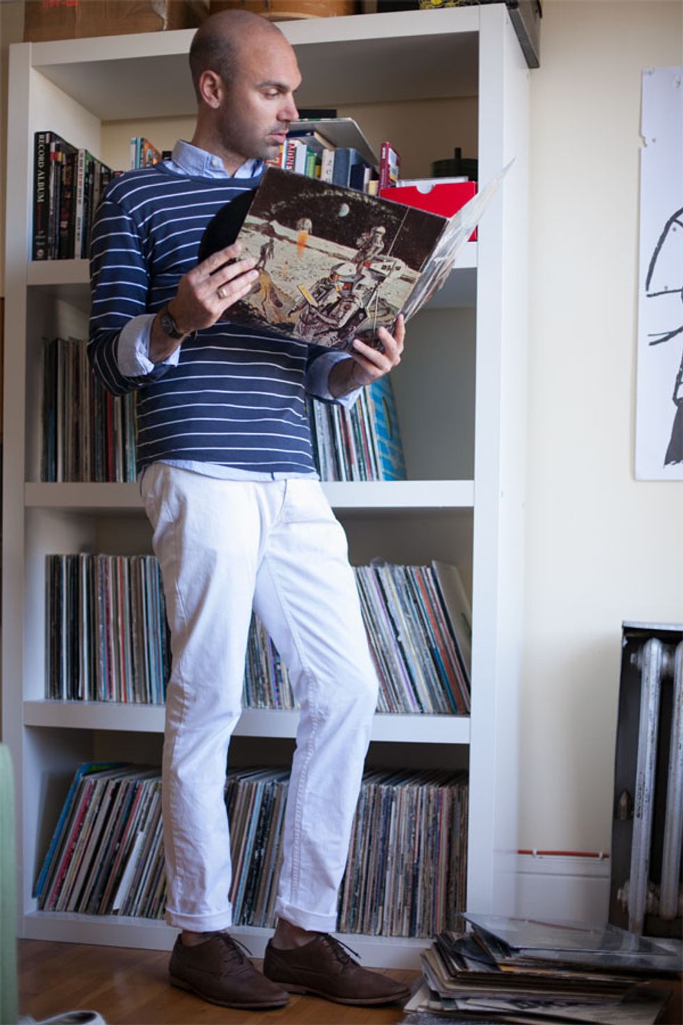 What he's wearing in his Mission district apartment: Hawkings McGill blue button-down shirt, purchased from Urban Outfitters; L.O.G.G. striped shirt, from H&M; White trousers from United Colors of Benetton; Brown leather Seal of the Sutro oxfords, purchased from Shoe Biz.