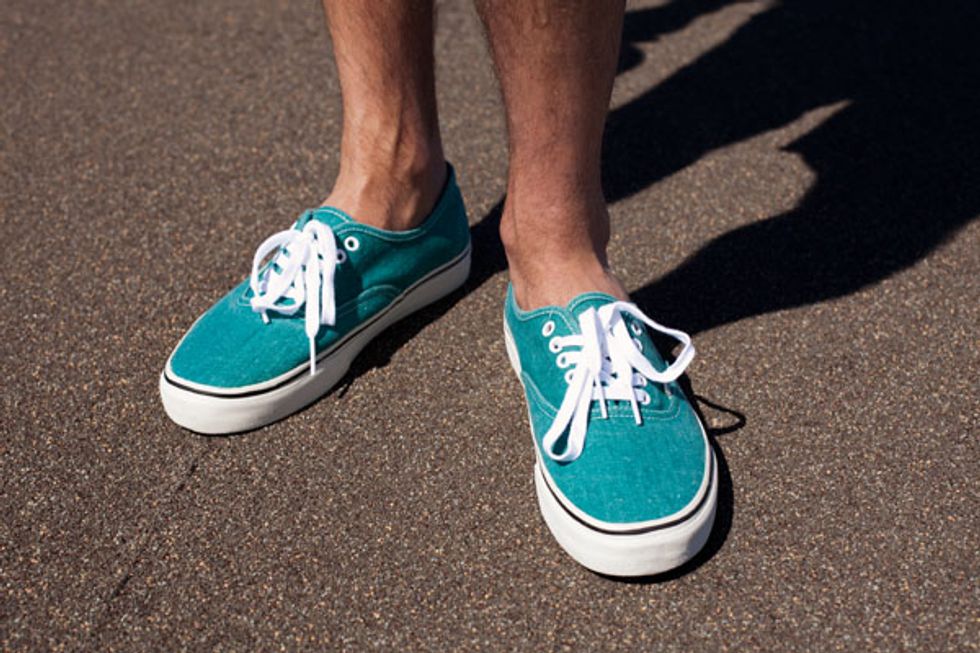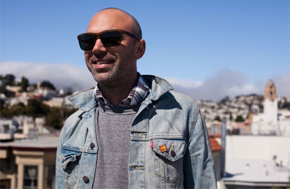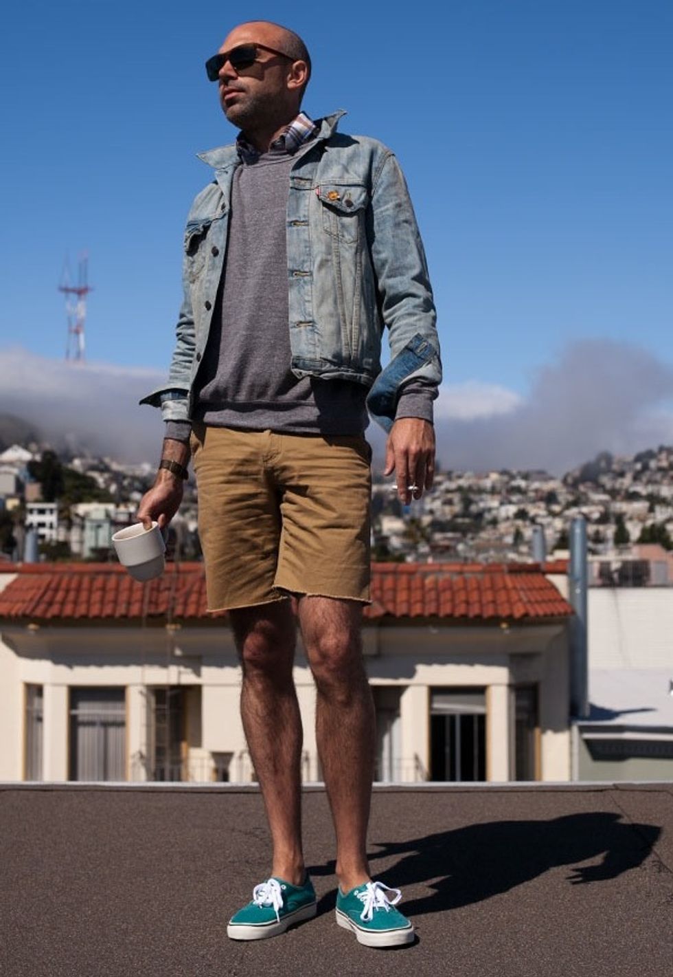 What he's wearing on his rooftop: Vintage plaid shirt, purchased from Squaresville in LA; Gray Alternative Earth crewneck sweatshirt, purchased from Alternative Apparel; Levi's denim jacket, purchased from New Jack City; Hawkings McGill tan shorts, purchased from Urban Outfitters; Teal Vans sneakers, from Urban Outfitters; Paul Smith sunglasses, purchased from Bloomingdale's; Enamel pin, purchased from street vendor on Valencia.
