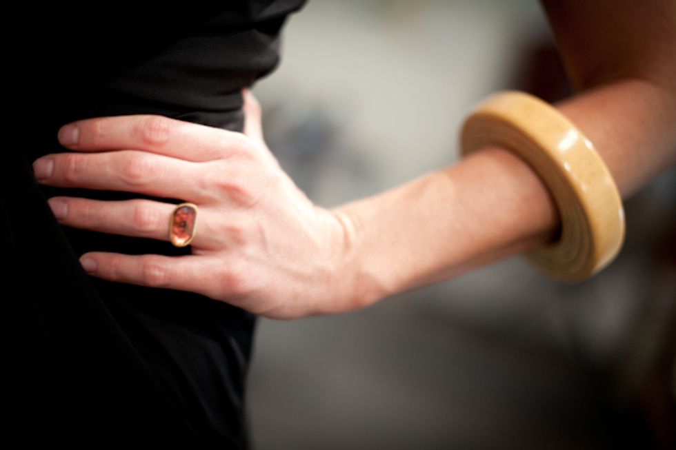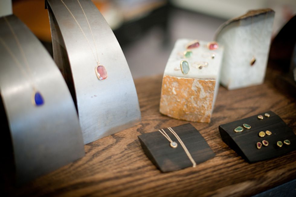 Meet NY-based jewelry designer Katie Finn, the mastermind behind Elizabeth Street Jewelry. Katie has been designing her own jewelry line since 2008, and each piece of her collection is hand made in her studio in Brooklyn. We caught up with her (looking oh-so fabulous in this black pantsuit) at her SF trunk show, last Saturday at Love & Luxe.