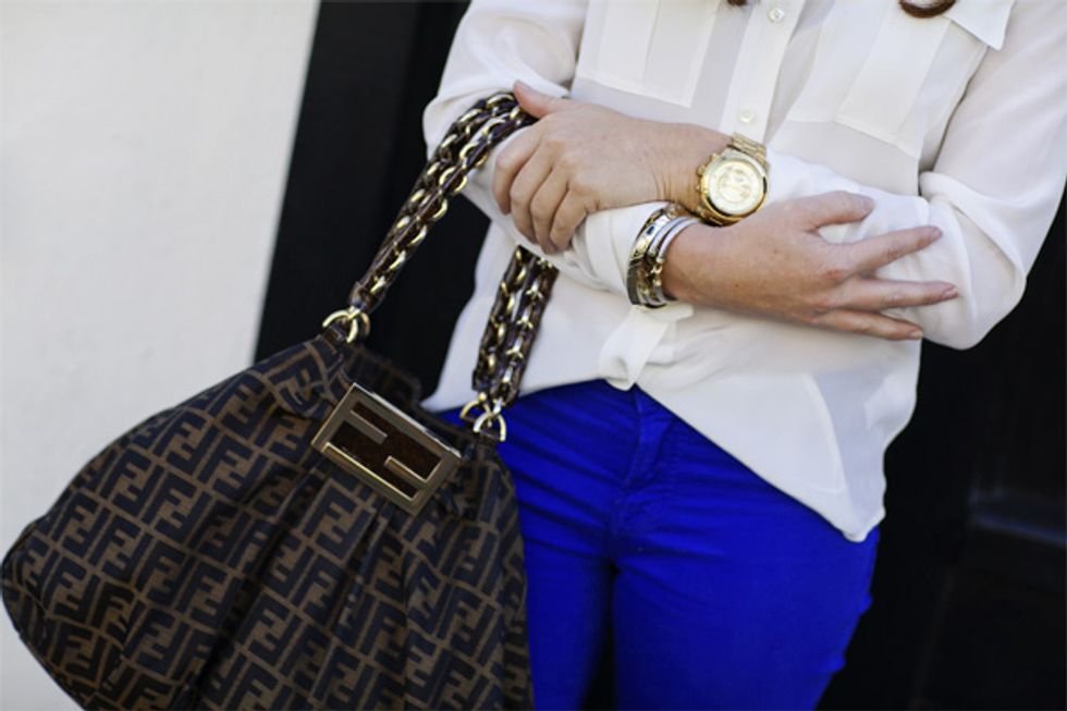What she's wearing: Cream button-down blouse from J. Crew; Royal blue J Brand jeans from Barneys; Ray Ban aviator sunglasses from Nordstrom; Fendi monogram canvas bag purchased from Saks Fifth Avenue, Layered necklaces from Arm Candy in Santa Monica; Michael Kors Oversized Runway Watch in gold; David Yurman braided bracelet from Neiman Marcus; Energy Muse "Manifestation" and "Lotus" bracelets gifted from mother; Brown strappy Eva & Joe sandals from Off Broadway Shoes.