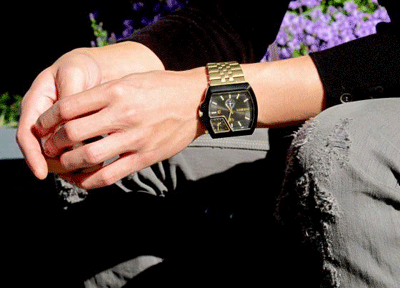 What he's wearing: Black knit jacket, gray ripped jeans, and black lace up boots from Diesel, glasses by Calvin Klein, square stud earring from eBay.