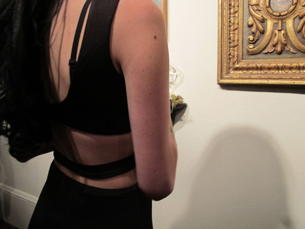 What she's wearing: Black cut-out dress by Paprika, purchased from ASOS; Black Jeffrey Campbell pumps purchased from Shoe Biz; Necklace and Seance hand cuff by Blood Milk; Assorted jewelry from thrift stores and shops on Haight St; Tattoos by Derick Montez at Picture Machine and Mary Joy at Tattoo City; Hair cut and color by Georgia and Pretty Pretty Collective.