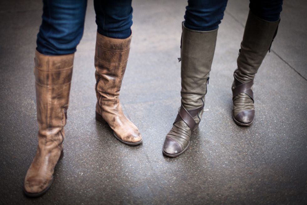 We spotted partners Liz King (left) and Judith Powell (right), toughing the weather in cute coats and distressed boots, while out for a shop on Market St. Liz works retail development and oversees some of the construction of Apple stores, and Judith is the executive director of The First Tee of SF, a youth development program. When they're not hard at work, the two are busy shopping and eating local, in SF and beyond.