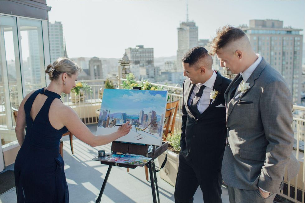 If you prefer to say "I do" outside, the terrace in the opulent Mark Hopkins suite is the ideal location for small alfresco nuptials. Only the simplest of garlands are needed to enhance this space where the SF skyline doubles as decor and provides the perfect backdrop for live painter Talia Koval to capture your special moment.