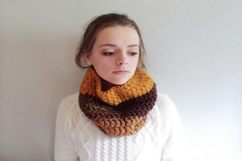This handmade color-block cowl, in shades of caramel, toffee, and brown, has Love Story written all over it. Click over to Etsy and embrace your inner Ali MacGraw. // $34 from Rukaa (SF), etsy.com