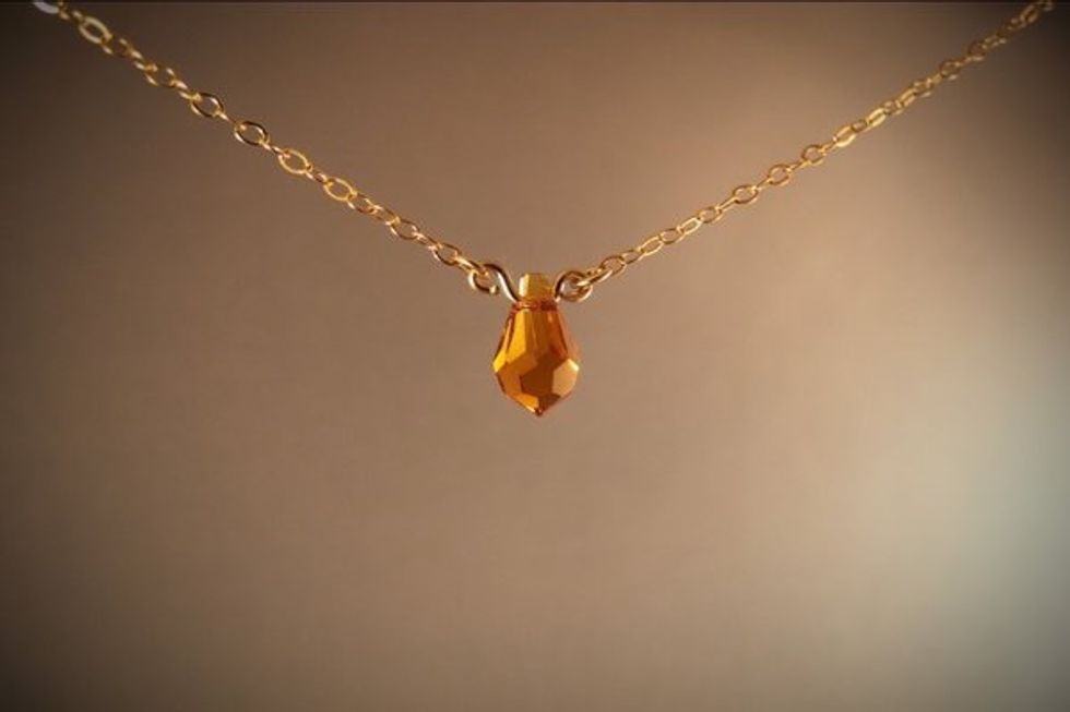 Sometimes a dainty statement is the best kind. November babies will especially love this faceted Swarovski teardrop crystal charm, suspended in 14-karat gold-filled wire, for its citrine hue. // $24 from La Luna Jewelry Studio, etsy.com