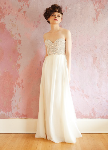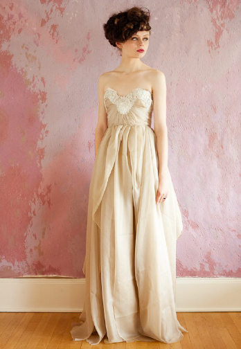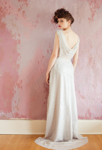 Full of romance and femininity, Seven's designs are for the modern bride who seeks the finer details, rather than tradition. You'll find long and short styles crafted from natural fabrics, silk, wool, linens, cotton voile and recycled vintage fabrics. Seven also gives back: With each purchase, the designer donates 5% of sales to charities.