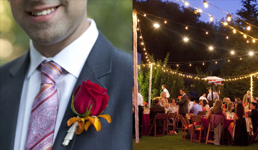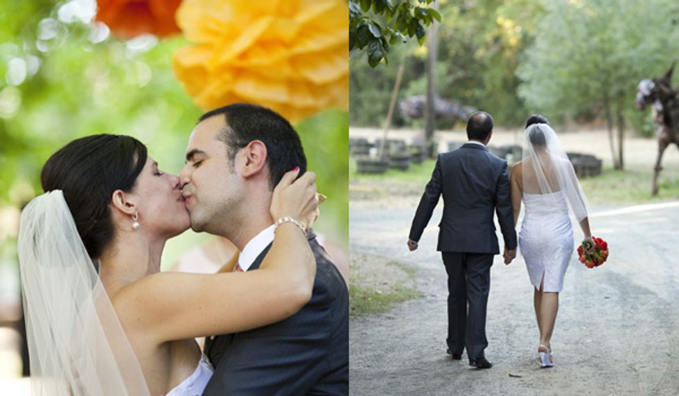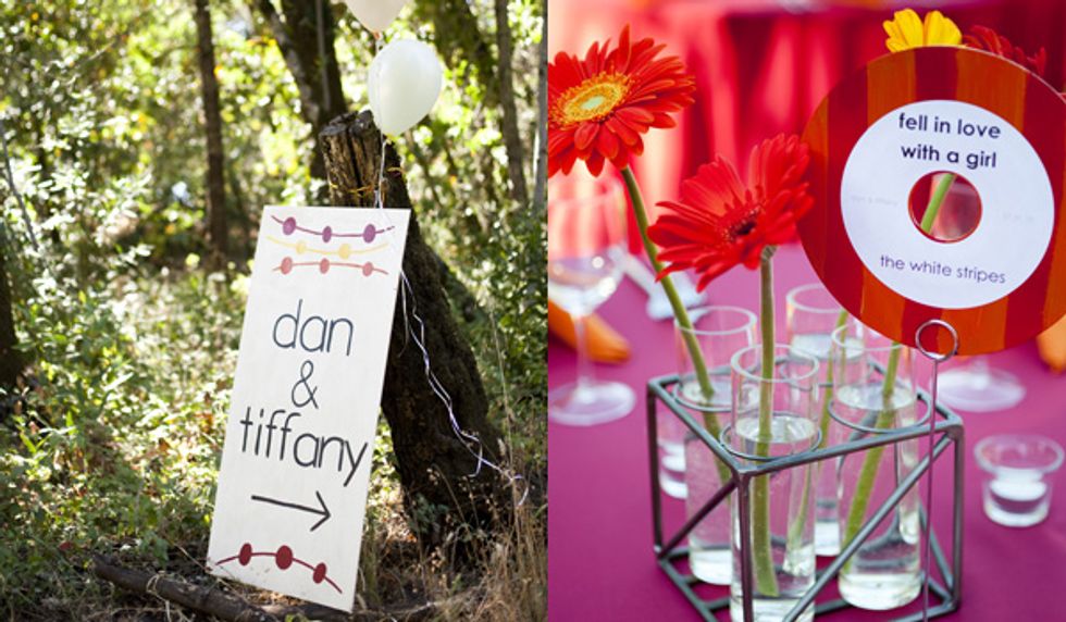 “When I explained to people that our colors were red, orange, and yellow, they thought I was nuts. And I can see why. You pick bold colors like that and all you can think of is finger painting. We spent lots of time in photoshop and at the rental place putting swatches of linens together. It is possible to bring in an array of colors—you just have to be smart about it. Having that much color at our venue was amazing. Being outdoors, the colors around us were neutral and subdued, so having color in our details made them that more noticeable. You know how they say people only remember the food, music, and booze? Not with our wedding—people remembered our pom-poms and linens, and flowers!"