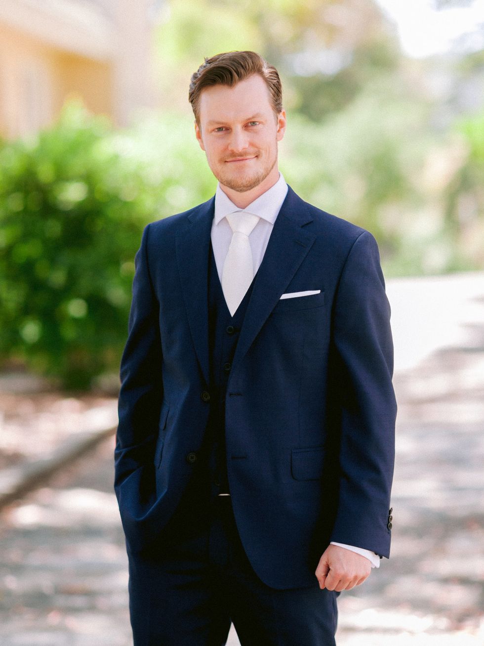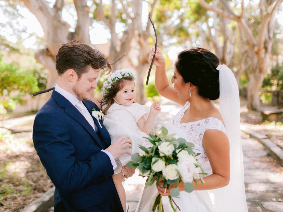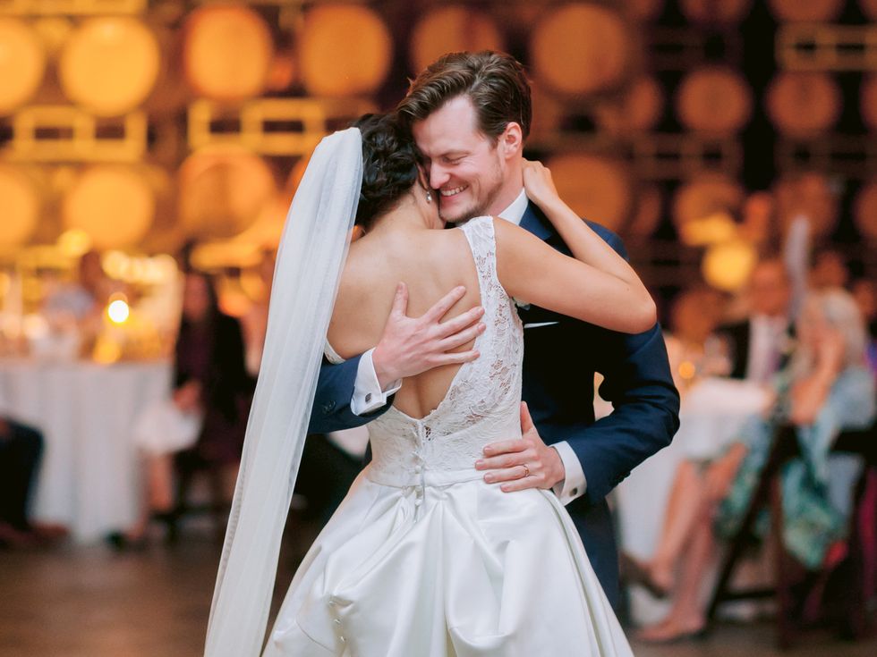 The groom wore a custom navy blue three-piece suit with a white shirt and ivory tie. The personalization continued with sweet elements like their monogram embroidered on the inner lining of the jacket, grey and red maple leaf socks to pay homage to Canada, and his grandfather's cuff links, gifted to him by his grandmother.