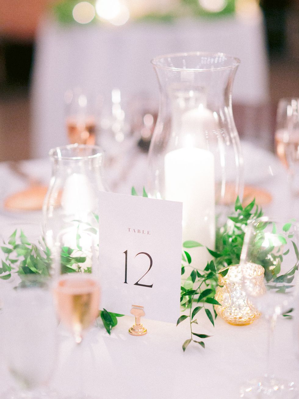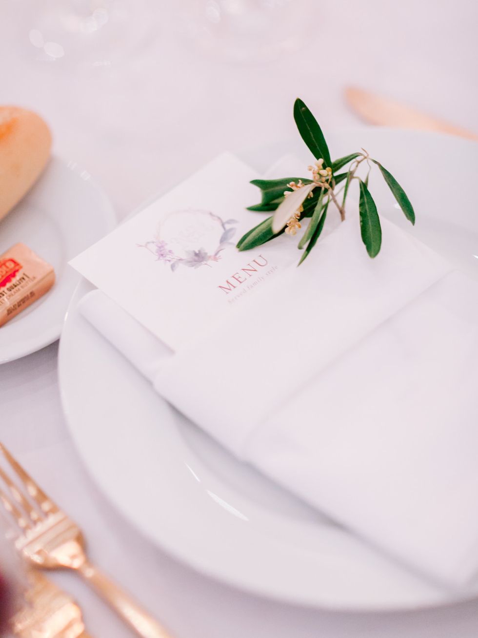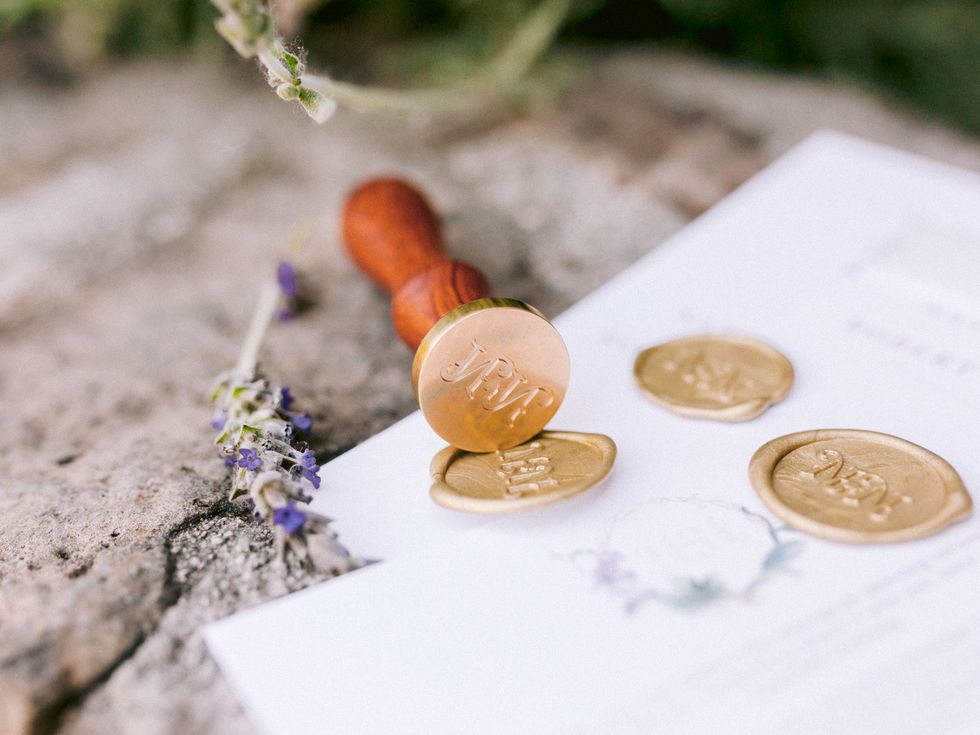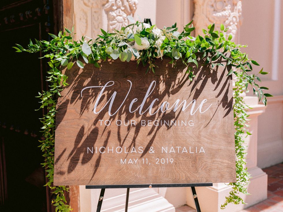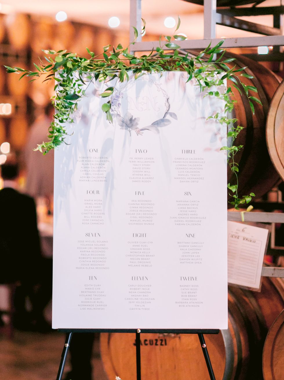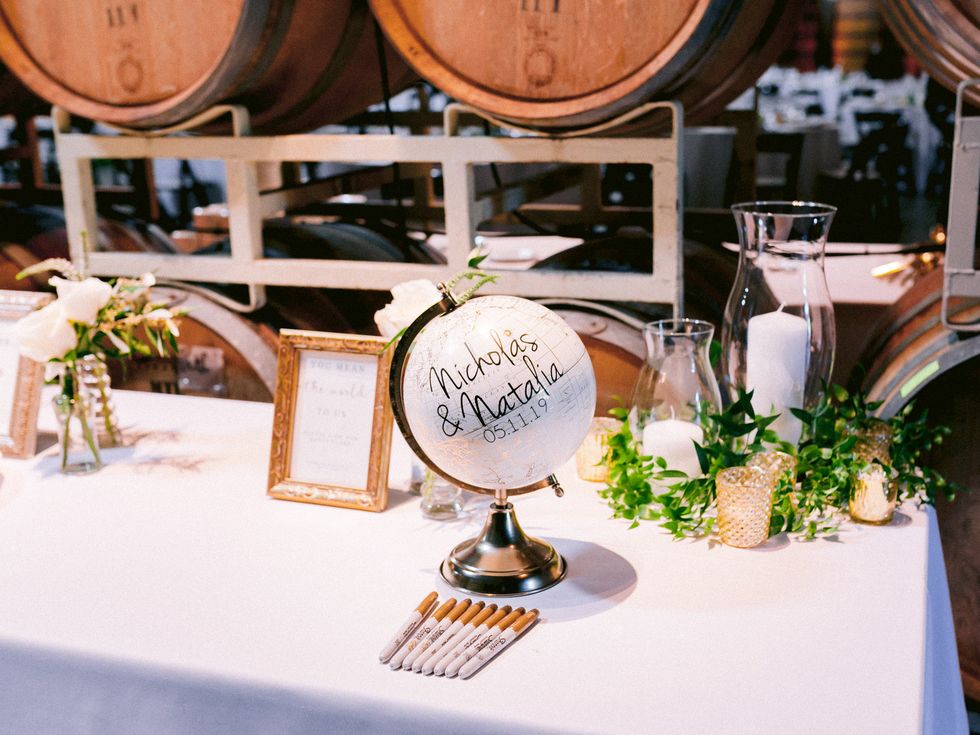 They commissioned Guay-Ross' 94-year-old artist grandfather to create a monogram representing their union. He fell ill halfway through their planning, but finished the lettering in his final days; his grandmother would finished the monogram. Made up of three elements, it fused the maple leaf of Guay-Ross' Canadian homeland; the guaria morada, the national flower of Calderon's native Costa Rica; and vineyard leaves and tendrils to represent California, the state they call home. The monogram became the central point in their decor, making its way into invitations, ceremony programs, dinner menus, and the seating chart.