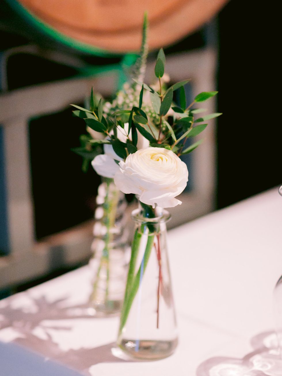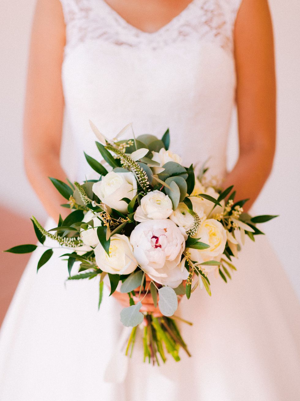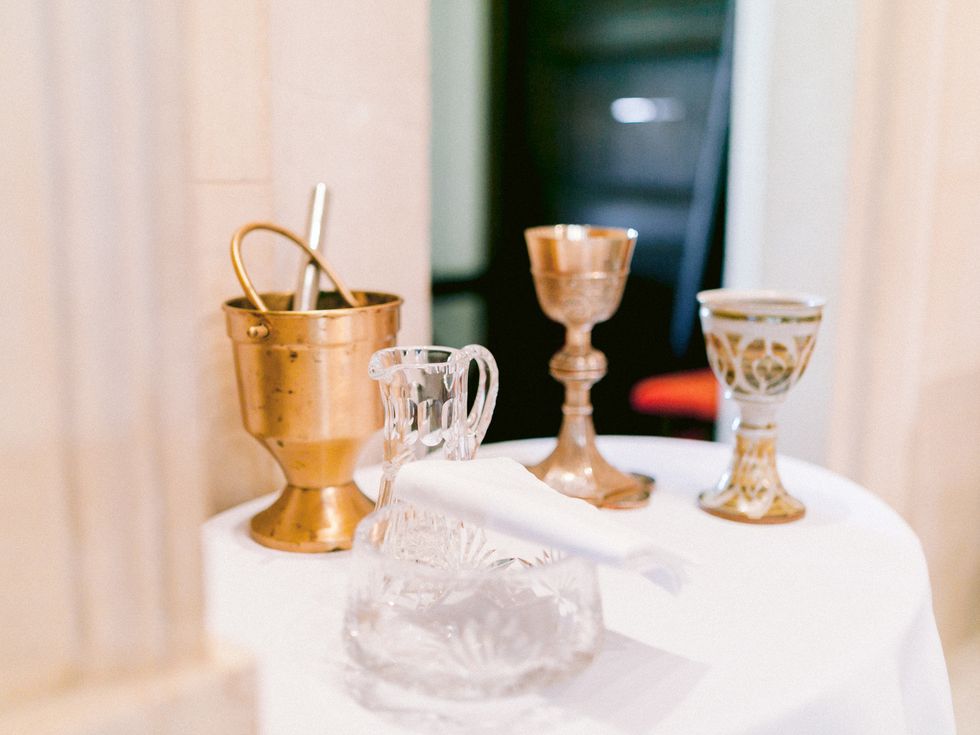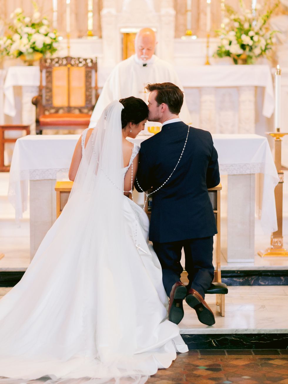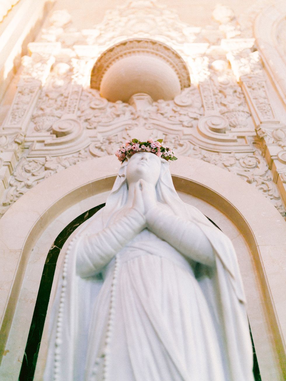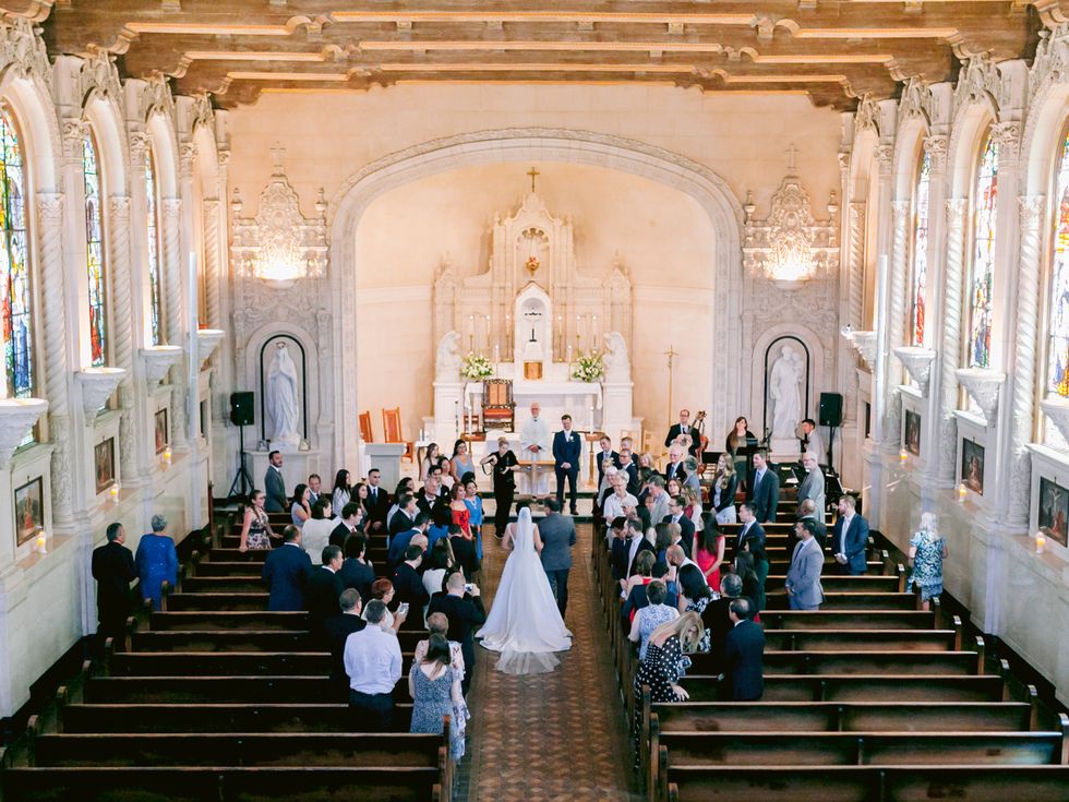 "Our ceremony incorporated multiple Catholic and Latin American traditions, including the offering of orchids to the Virgin Mary statue," explains Guay-Ross. They also honored Calderon's late grandmothers with portraits at the statue's feet. The mixed culture festivities continued with a traditional Irish hymn, and two liturgical readings in Spanish and French. In order to enhance the natural beauty of the venue, they kept florals to a minimum with a white and ivory palette paired with dark, lush greenery. They used orchids to present to the Virgin Mary in a nod to Calderon's mother's wedding day.