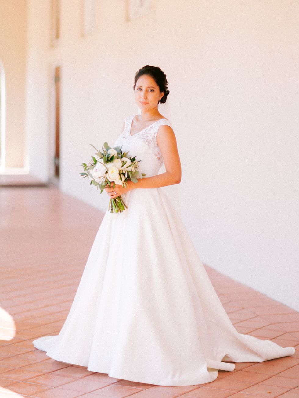Calderon wanted a simple look and selected an ivory A-line gown with a clean skirt, customized with an open-back and cap-sleeve lace bodice. Within the lace was a design embedded with the leaves of guaria morada.