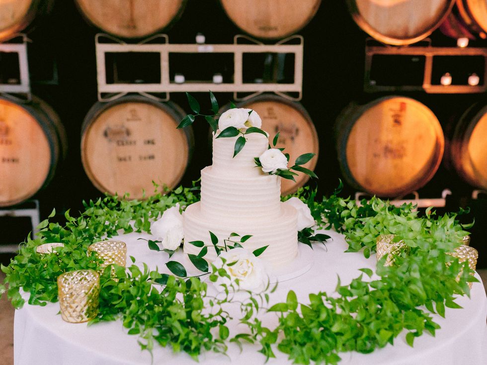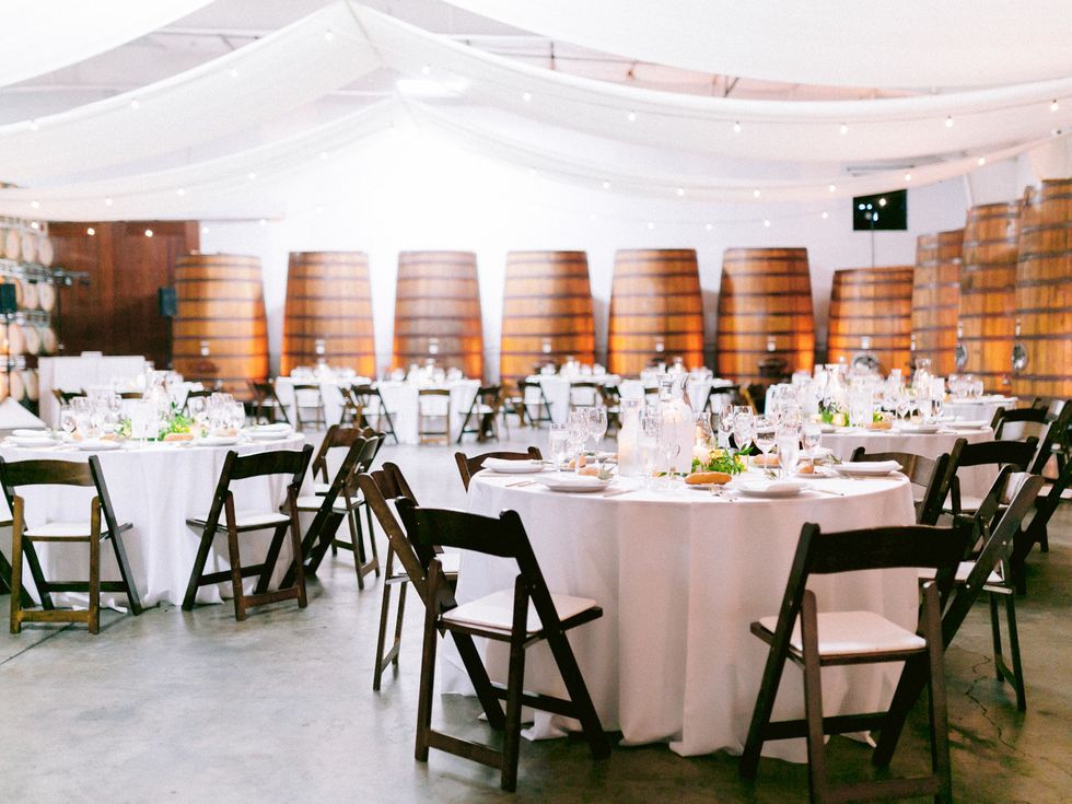 Wine and cheese hour and took place alongside the pond in the gardens of Cline Cellars. For the reception, they strove to create a romantic and soft ambience. "Our biggest focus was candlelight from an array of glass hurricanes and mercury votives, surrounded by dark lush greenery," says Guay-Ross. "Our guests were surrounded by hundreds of magnificent wine barrels decorated with tea lights, and we did not want to take away from that natural rustic beauty."