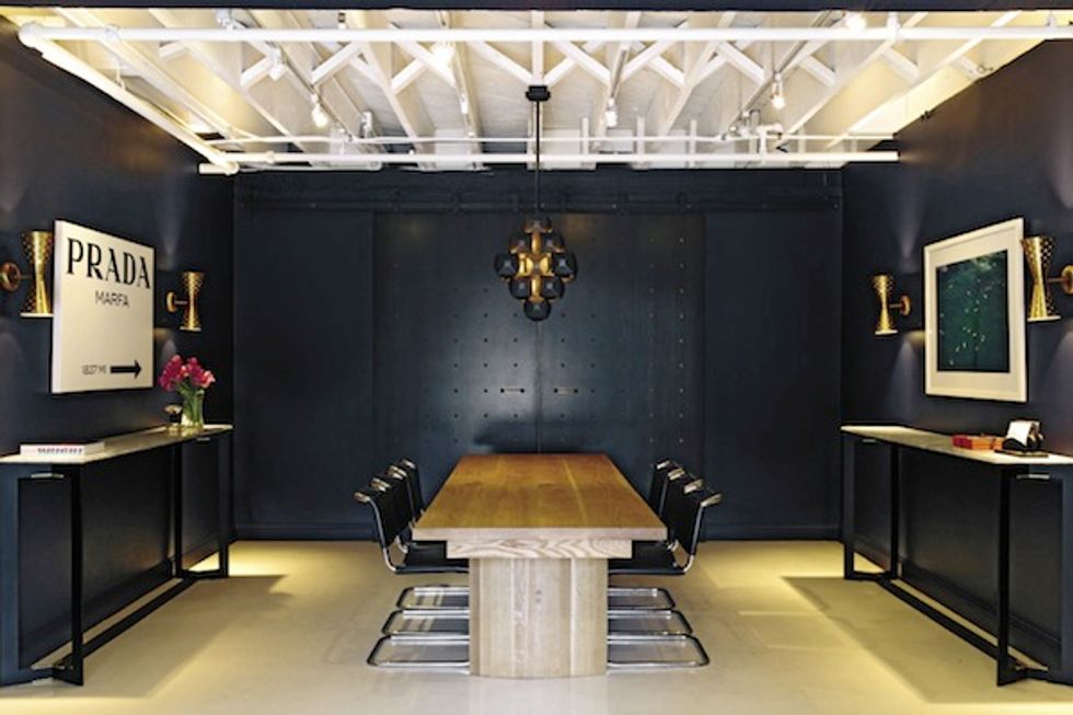 Such austerity might seem dramatic elsewhere, but in Kwong’s luxury-loving hands, the overall essence of swank is undeniable. As an expression of her lavish aesthetic, the conference room is awash in deep navy paint, studded with gold sconces, and stocked with design tomes. Mies van der Rohe leather chairs surround a sprawling oak table, and an oversize print of the ocean, by Gray Malin, hangs opposite a canvas Prada Marfa sign by Elmgreen and Dragset. The ultimate finishing touch, a stunning steel chandelier by Blackman Cruz (a souvenir from the office she created for the 2012 SF Decorator Showcase), bestows warm illumination for late-night brainstorms. Kwong says, “Now we’re ready for the big things coming our way.”