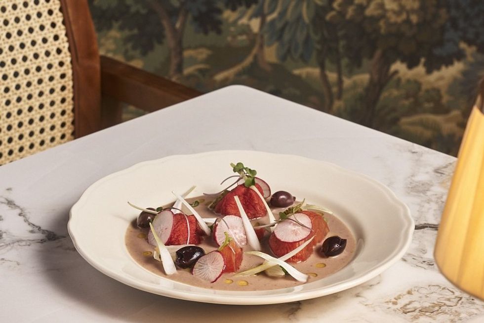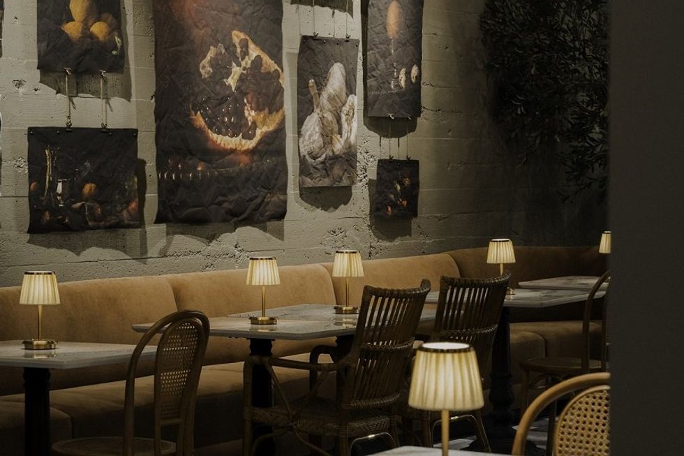 My table sits beneath the branches of an olive tree (Spain, olives, olive oil—you get it), with a gallery wall of fruit and vegetable paintings in gothic tones on one side, and on the other, an raised Art Nouveau-style salon with vintage green-patterned wallpaper and a roaring fireplace. Designers Adean Studios gave the front bar mirrored paneling and fringed light fixtures, while in the main dining room, they created the illusion of a garden patio with bistro-style rattan chairs and velvet banquettes in soft creams and caramels. Geometric wooden cutouts at ceiling level subtly define the different spaces.