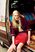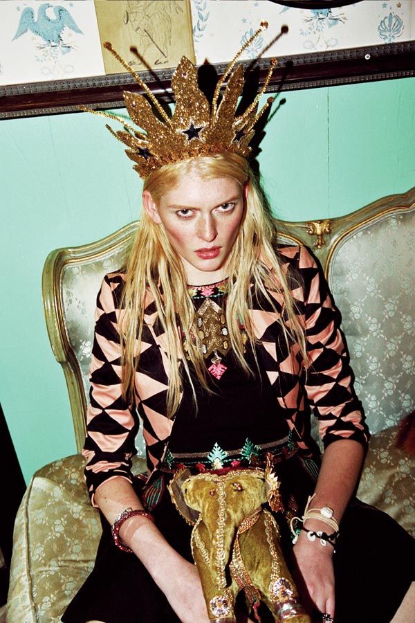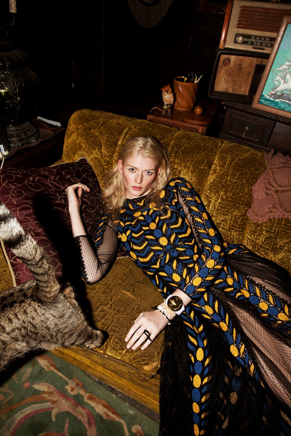 Miu Miu parrot printed dress ($3,665), mandarino cotton tights ($275), patent leather bracelet ($520), and multi-color necklace ($570). Levi’s denim vest ($68). Lanvin crystal bracelet ($585) at Neiman Marcus. Belt, stylist’s own.