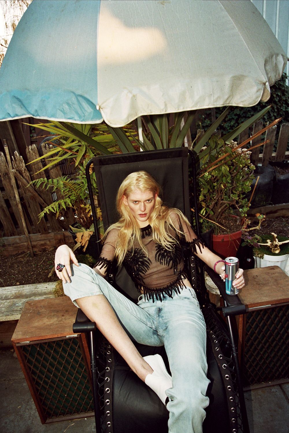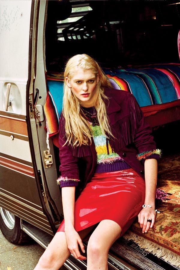 Thakoon laser-cut backless dress ($2,590). Vintage sweater ($65) and suede fringe jacket ($65) at Wasteland. Lanvin eagle pendant necklace ($1,870) at Neiman Marcus. Lynn Ban black diamond stackable jagged rings ($710 each), at Barneys New York. Shell bracelet, stylist’s own.