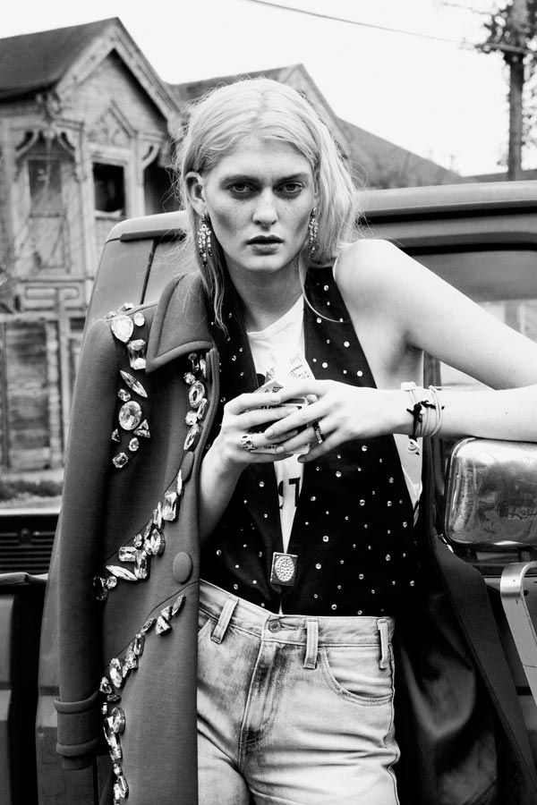 Prada embellished overcoat ($6,100). Vintage T-shirt ($38) and jeweled vest ($35) at Wasteland. Levi’s high-rise washed-out jeans ($78). Graff Diamonds Lotus Collection diamond and sapphire earrings (price upon request). Miles Eastman cactus ring. Lynn Ban black diamond stackable jagged rings; leather wrap bracelets, stylist’s own.