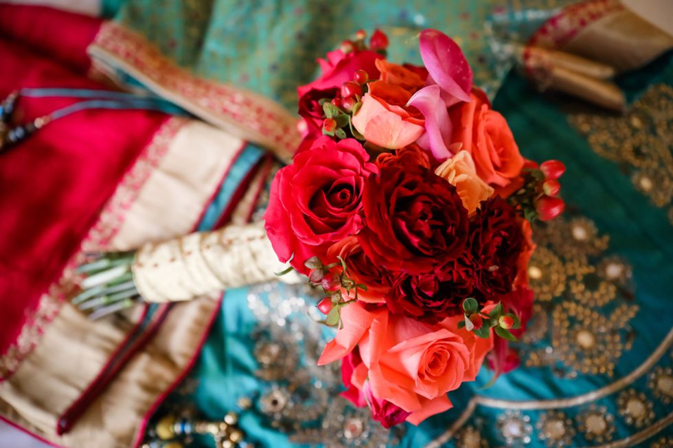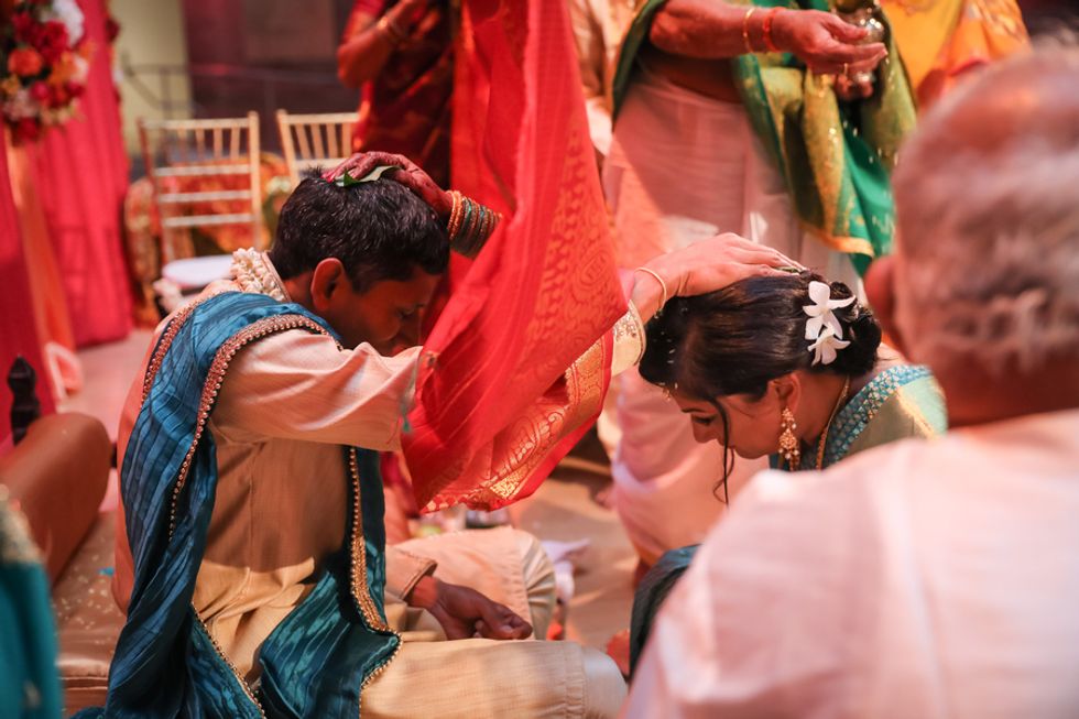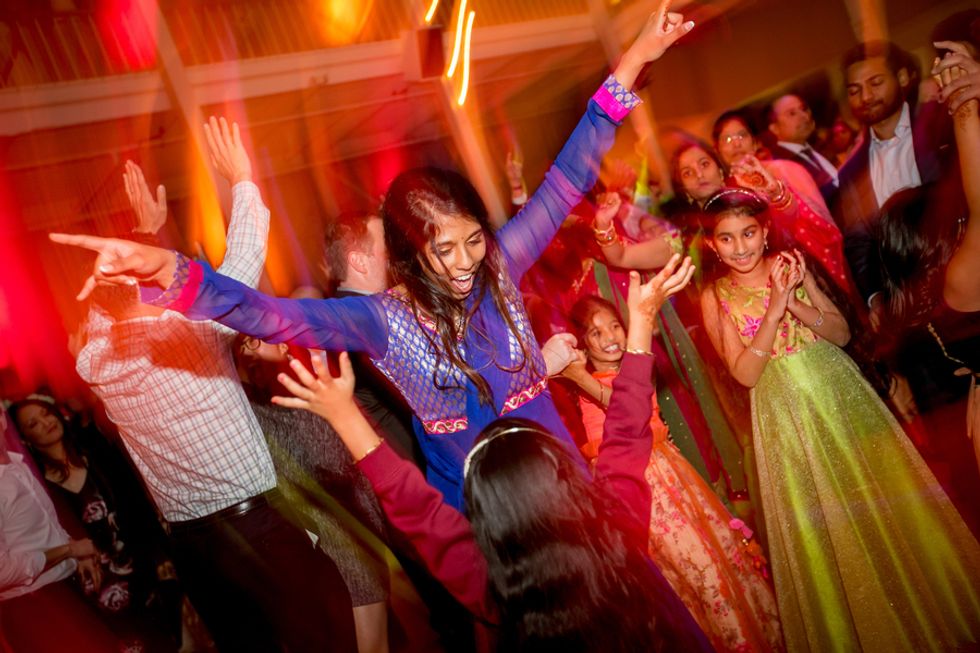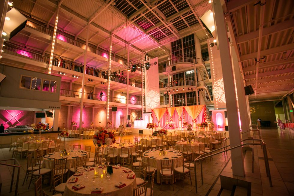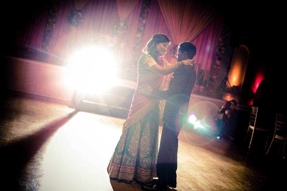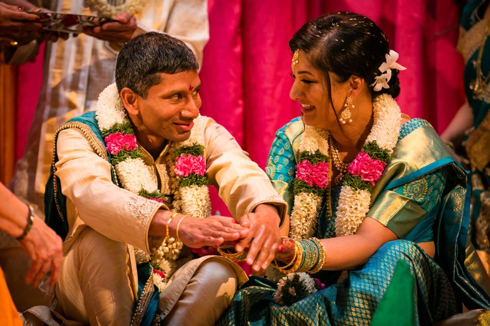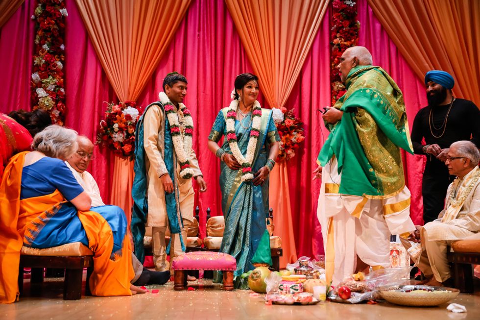 Kavitha and Rohini braved the rain for a cheerful photo shoot in the city before heading over to the San Francisco Design Center for a vibrant Hindu ceremony. On a stage swathed in bright pink and orange, the couple draped jaimalas (flower garlands) around one another and laughed together as rice fell from their heads.
